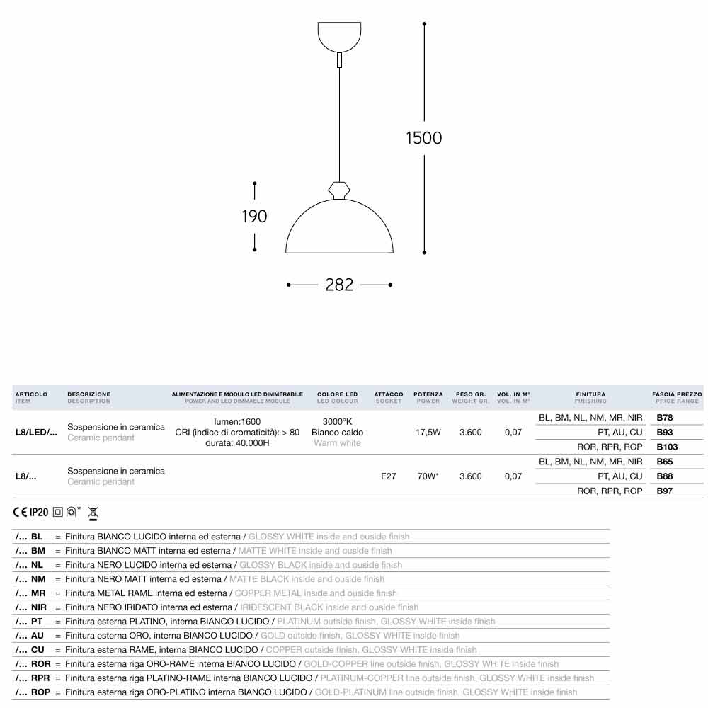 I Lustri 8 este disponibil cu diferite finisaje și cu soclu standard pentru bec E27 sau cu LED.