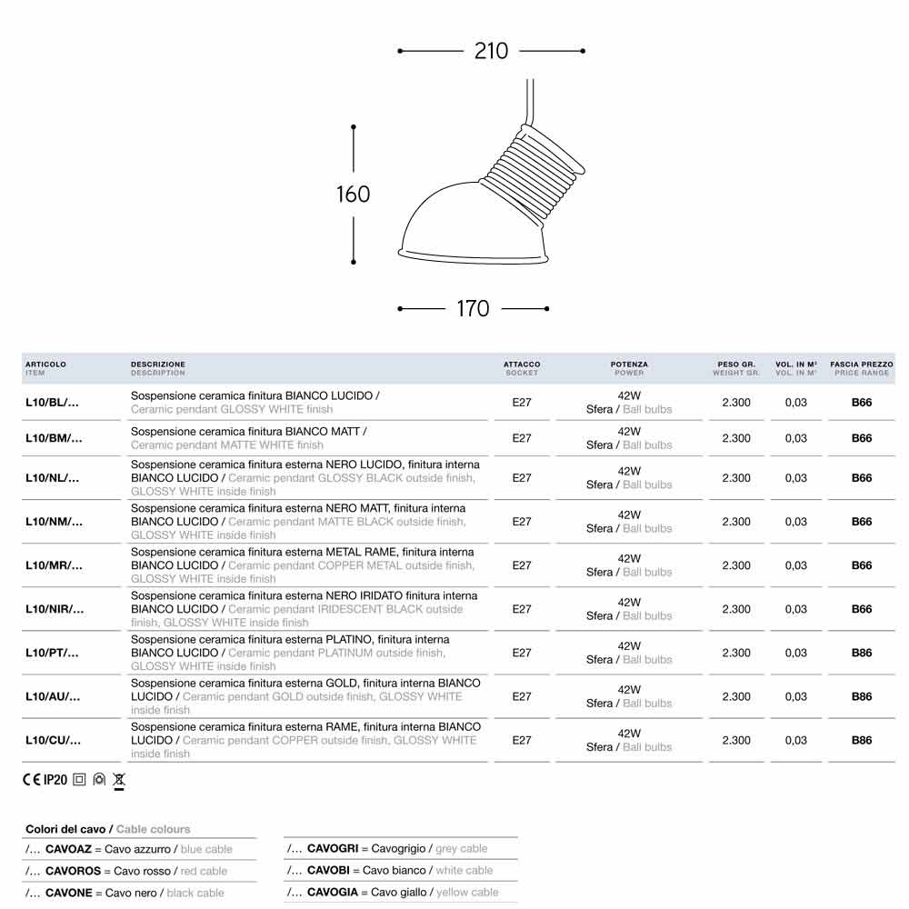 I Lustri 10 este disponibil în diferite culori și cu cablu albastru deschis, alb, roșu, negru, gri sau galben.