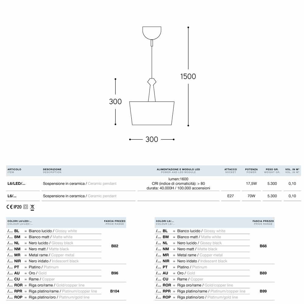 I Lustri 6 este disponibil în diferite finisaje și cu mufă standard E27 sau bec LED.