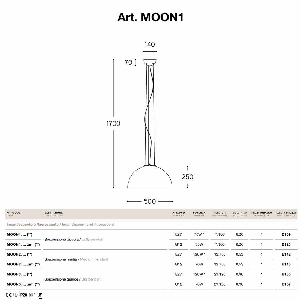 Moonlight este disponibil în diferite dimensiuni (mici, medii, mari) și în diferite culori: - argint în interior - aur în interior - bronz în interior Becul nu este inclus