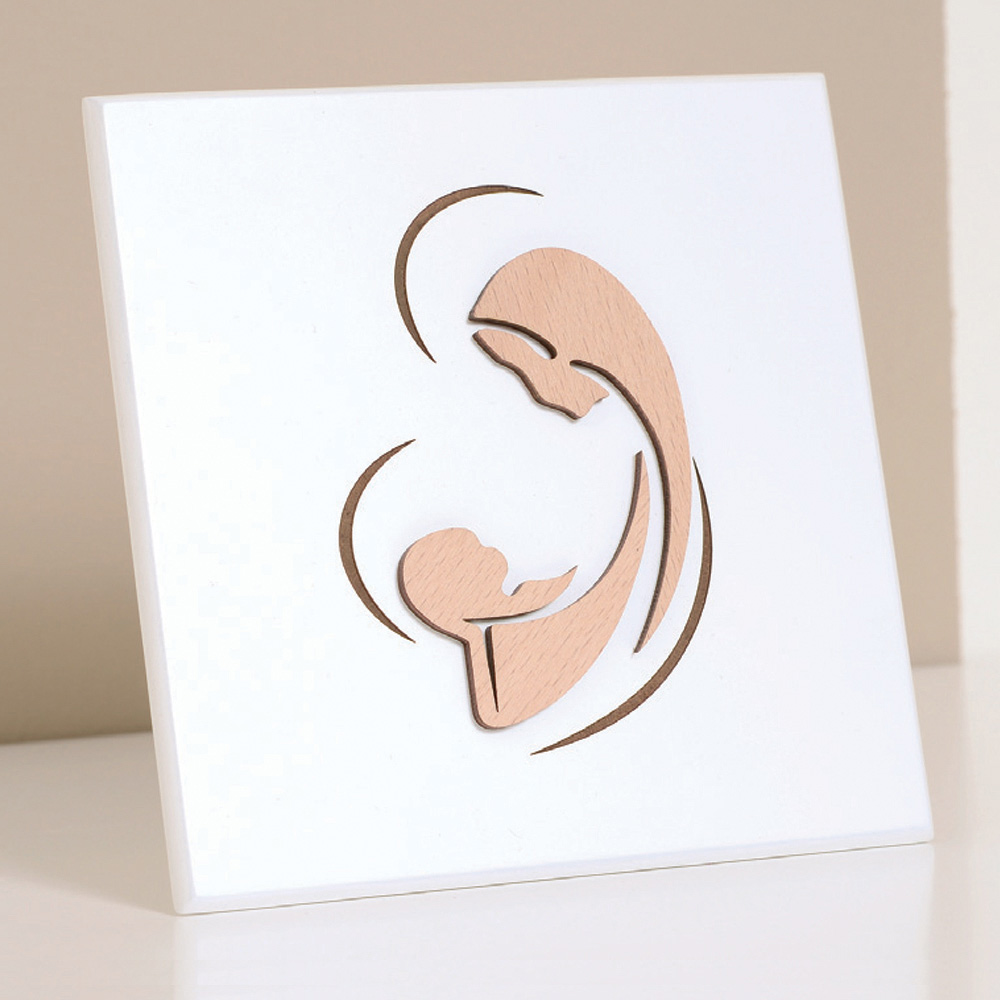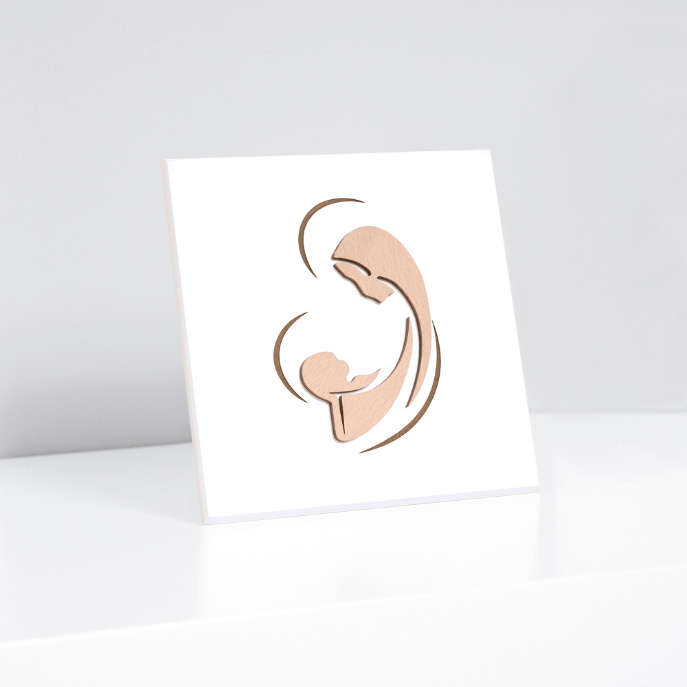 Tablou sacru cu mama si copilul stilizat, aplicat in lemn natural. Panou din lemn lacuit alb cu picior de sustinere si orificiu pentru a-l agata pe perete.