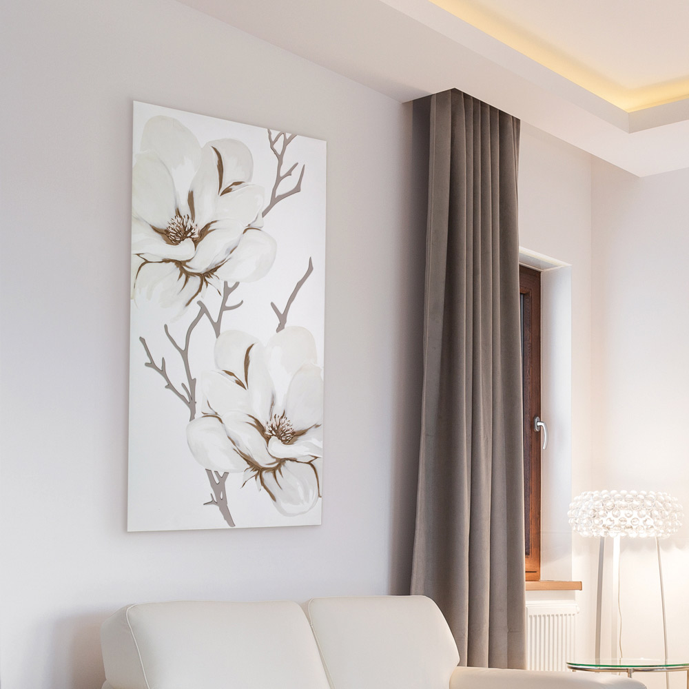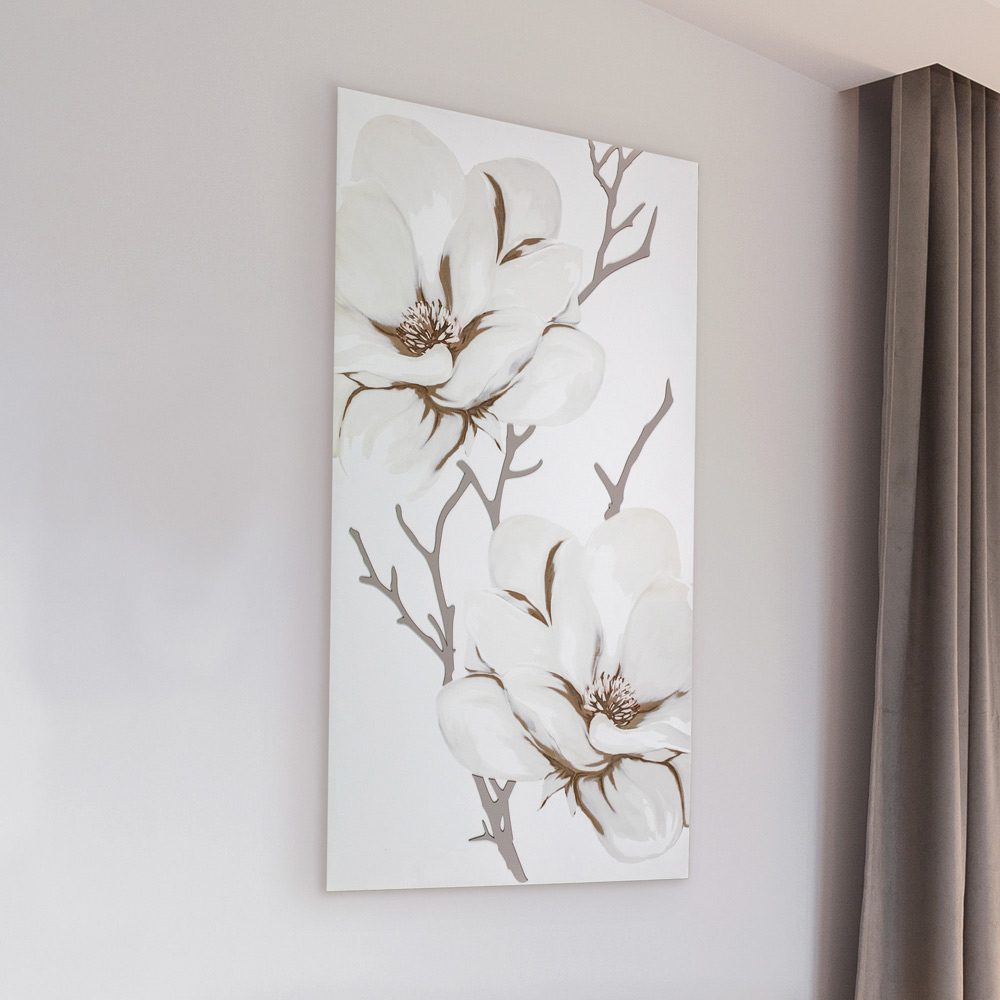 Panoul cu decor este realizat folosind tehnica de marcare cu laser care creează un basorelief pe material, creând diferite gradații de culoare ale petalelor create pe panou. Panoul Magnolia este realizat din lemn lăcuit alb mat cu aplicații de culoare pietriș . O piesa de mobilier eleganta cu doua flori delicate de Magnolia, gravate in detaliu cu laser cu decoratiuni de culoarea pietricelei.