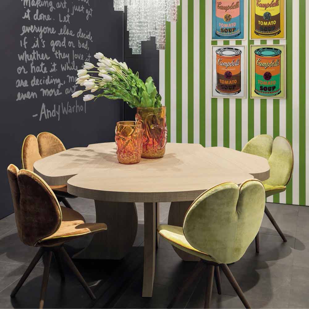 Andy este un tabel robust, simplu, elegant, design original și flori moderne în formă, potrivite pentru orice tip de mobilier. Caracterizat de „forma de flori original, aduce un plus de creativitate în orice mediu în cazul în care acesta este plasat. Tabel realizat de tâmplari complet în Italia, de design unic și inimitabil, caracteristica esențială este încapsulată în podeaua din lemn de stejar, în plin finisaj periat ceară, de la forma de flori originale. Baza sa este compusă din patru elemente în formă de curbe din lemn de stejar. Andy aduce designul său unic. Ideal pentru înființarea în săli de mese nunti si evenimente.