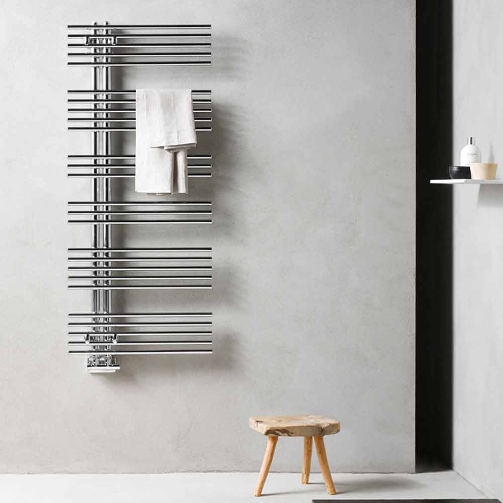 Încălzitor de prosoape hidraulic montat pe perete din oțel cromat, fabricat în Italia.
