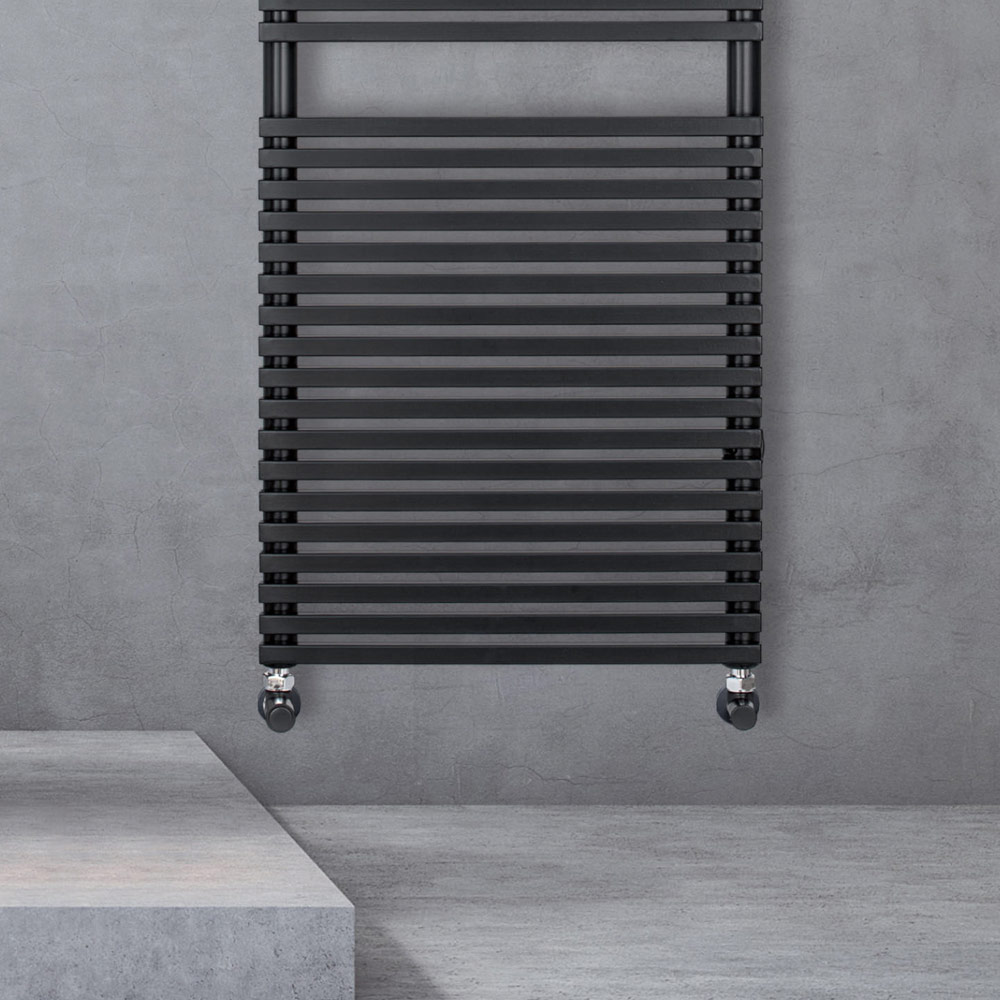 Suport pentru prosoape încălzit hibrid din oțel carbon cu finisaj negru jet format dintr -o serie de elemente orizontale cu secțiune pătrată de 2 cm sudate pe colectoare verticale cu diametrul de 3,5 cm. Fabricat în întregime în Italia , cu kit de fixare pe perete, supapă de aerisire și dopul oarbă inclus .