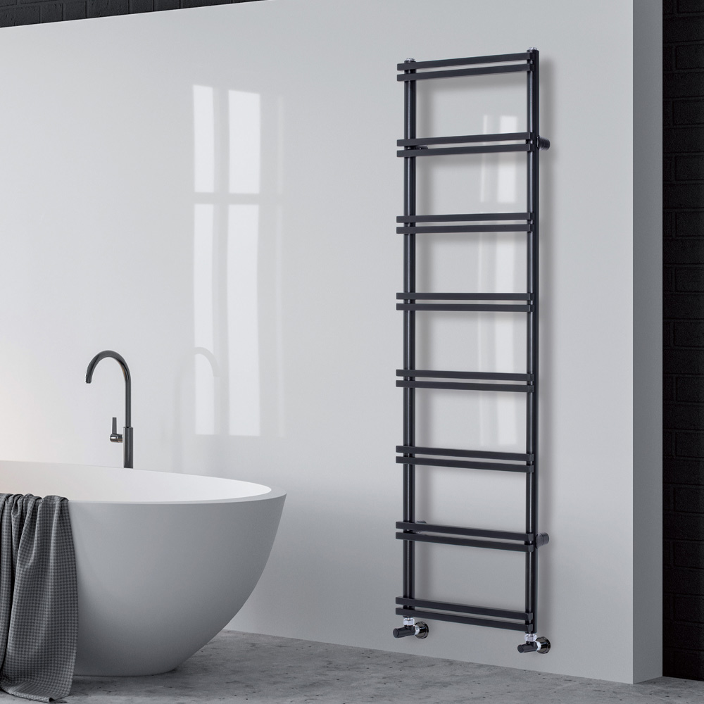 Încălzitor hidraulic pentru prosoape din oțel carboncu finisaj negru intens, format dintr-o serie de elemente orizontale cu secțiune pătrată de 2 cm sudate pe distribuitoare verticale cu diametrul de 3,5 cm, fabricat în întregime în Italia, cu kit de fixare pe perete, supapă de aerisire și capac orb incluse . Natura artizanală a acestui produs este semnul distinctiv al calității excelente, tipică Made in Italy. Acest produs satisface nevoile și dorințele unui consumator din ce în ce mai exigent și exigent, datorită finisajelor și materialelor premium utilizate în construcția sa.