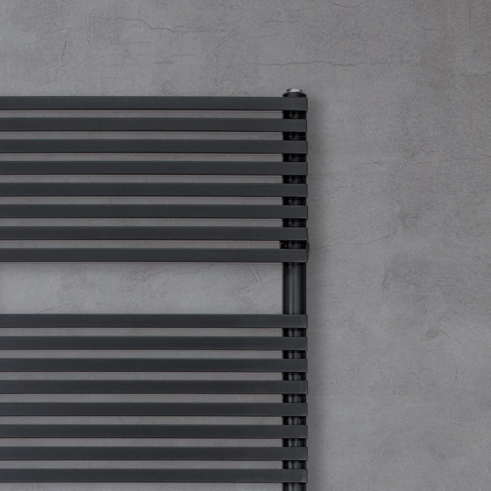 Încălzitor hidraulic pentru prosoape din oțel carbon cu finisaj negru jet format dintr -o serie de elemente orizontale cu secțiune pătrată de 2 cm sudate pe colectoare verticale cu diametrul de 3,5 cm, realizat în întregime în Italia cu kit de fixare pe perete, robinet de aerisire și dopul oarbă inclus .