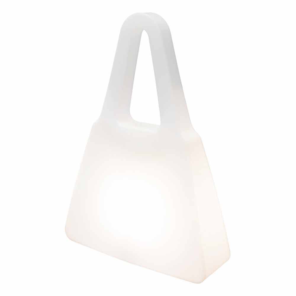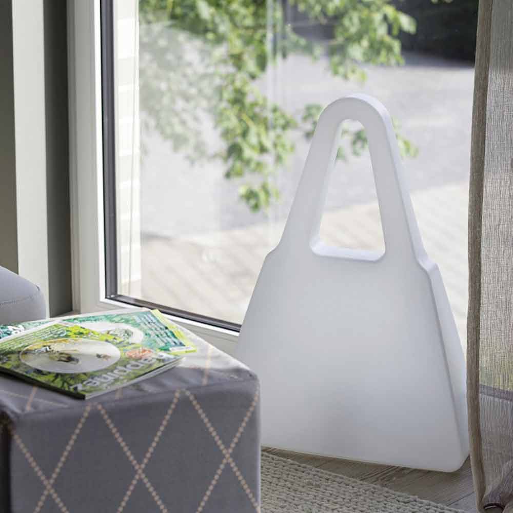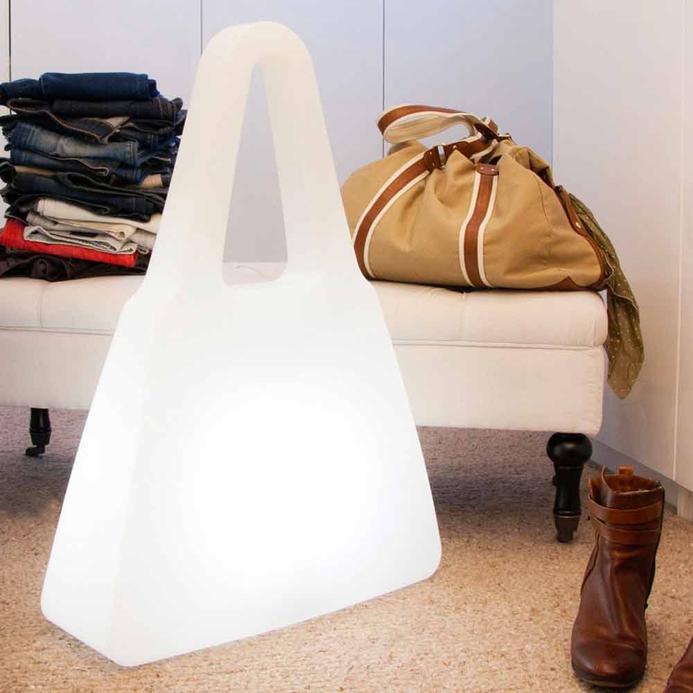 Lampă de podea sau de masă în formă de geantă, design modern din polietilenă cu conexiune LED, solară sau E27.