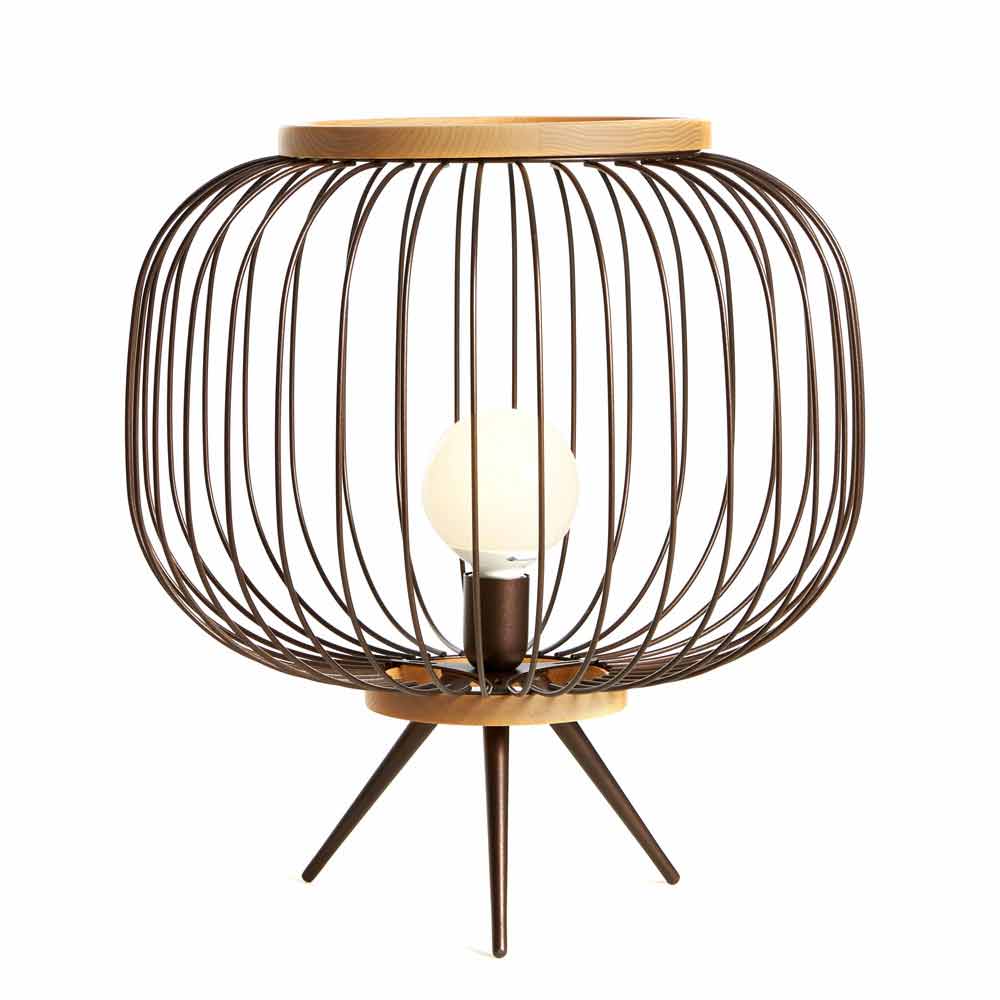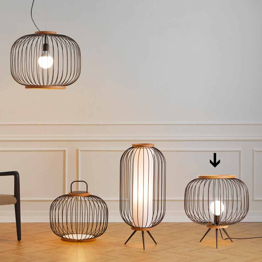 Lampa de podea din tija de oțel profilat și vopsit cu pulberi epoxidice. Cele două benzi care închid corpul sunt rotunjite din lemn natural. Versiunile la sol pot fi de asemenea utilizate ca svuotatasche fie fără abajur. Sursa de lumină LED-uri a versiunii cu mâner este echipat cu o baterie reîncărcabilă cu o autonomie dicirca 6 ore.