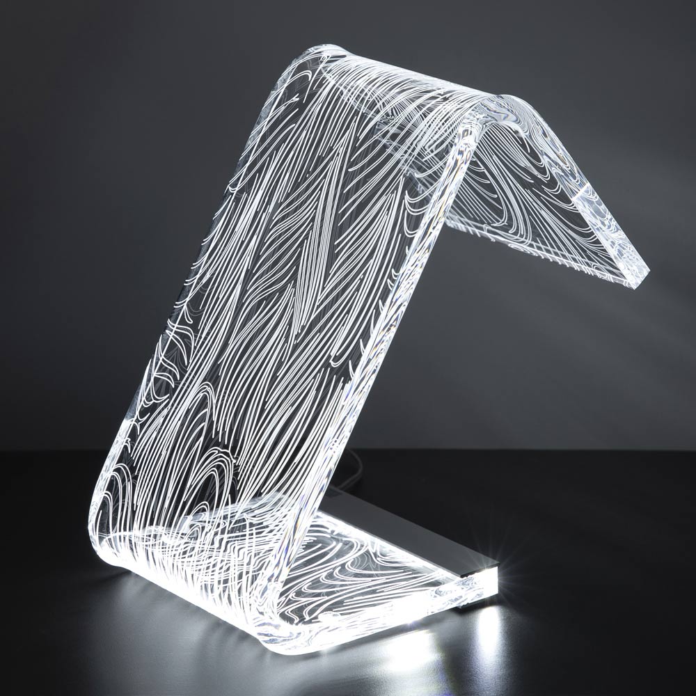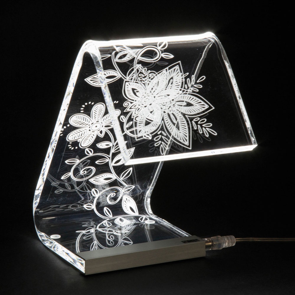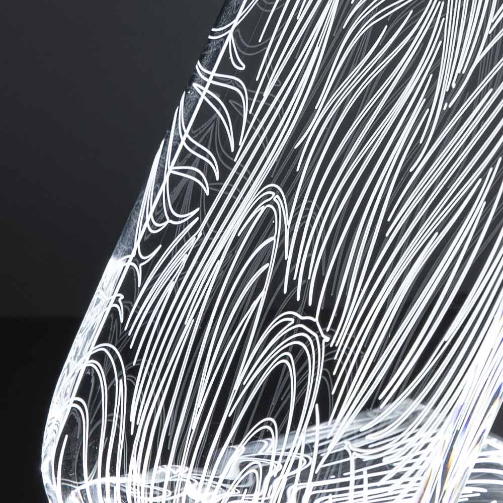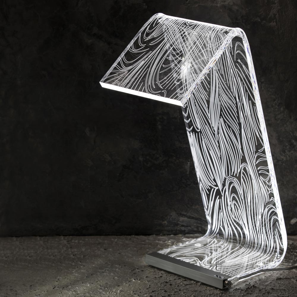 Lampa de masa din cristal acrilic transparent cu decoratiuni laser, 2 marimi fabricata in Italia.