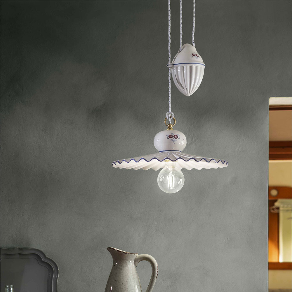 Lampă glisantă suspendată realizată manual din metal și ceramică pictată manual, fabricată în Italia de Ferroluce.