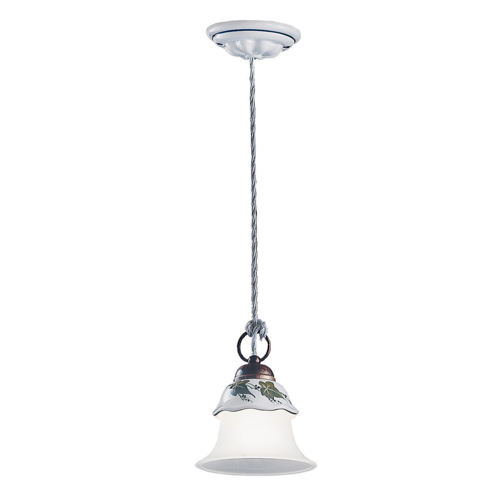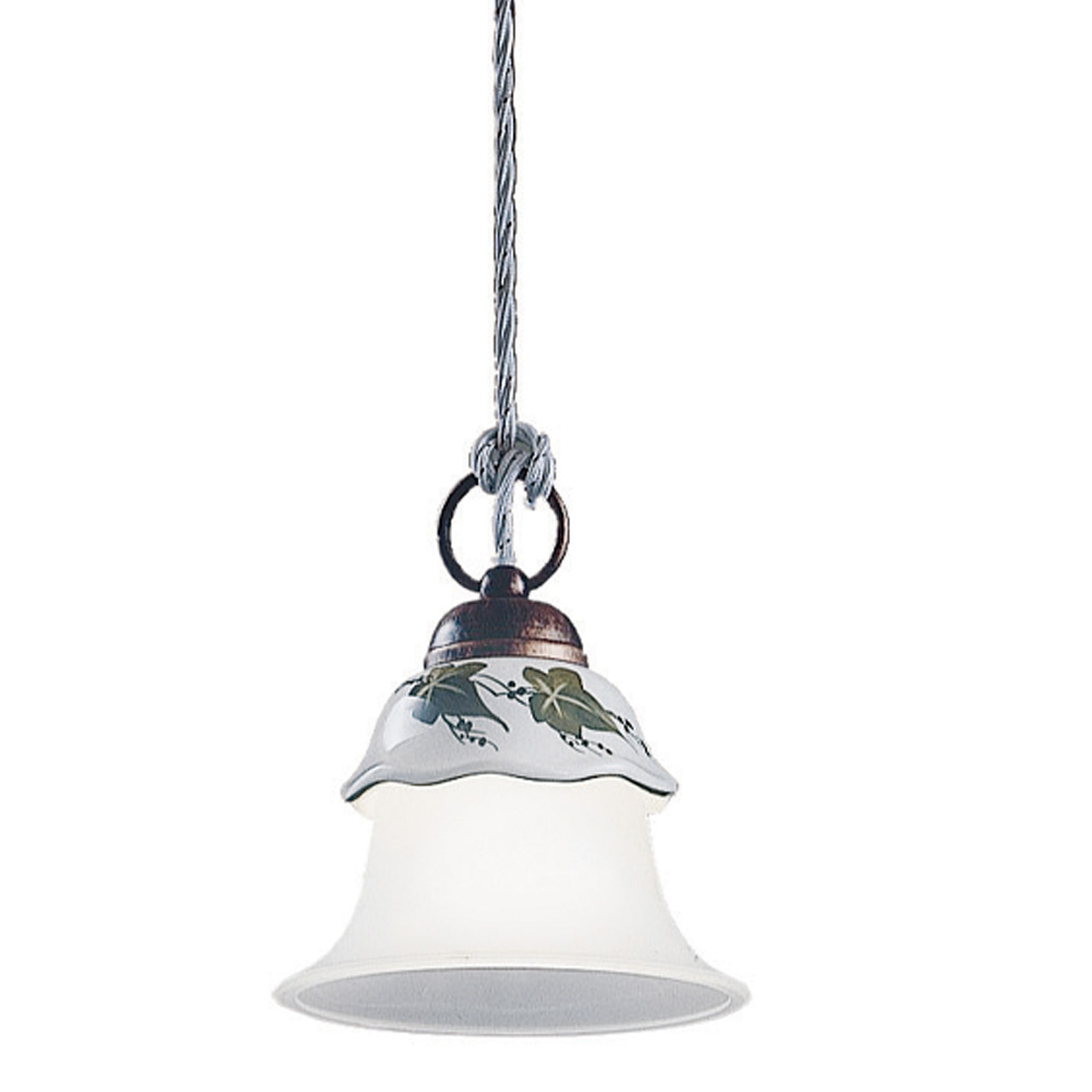 Lampă cu suspendare din fier, ceramică decorată manual și sticlă gravată cu acid fabricată în Italia de Ferroluce.