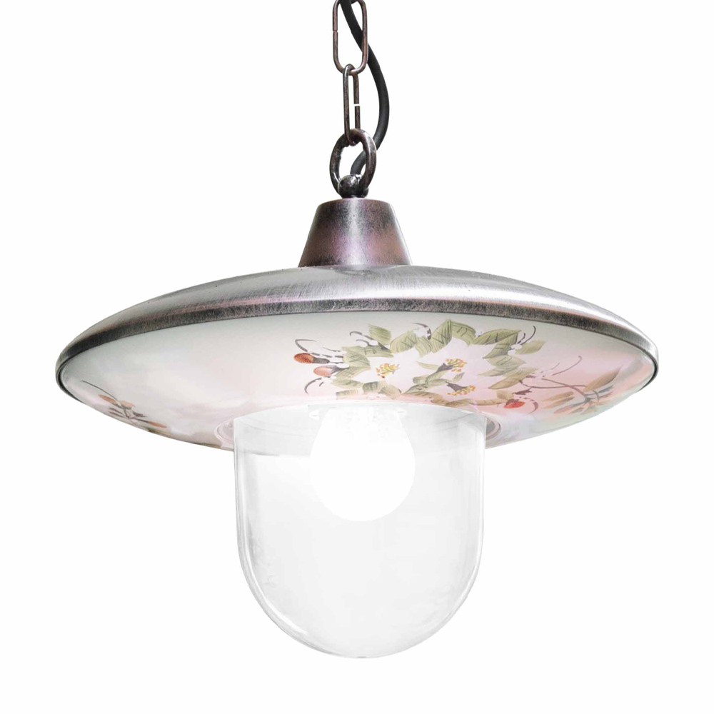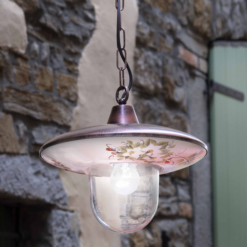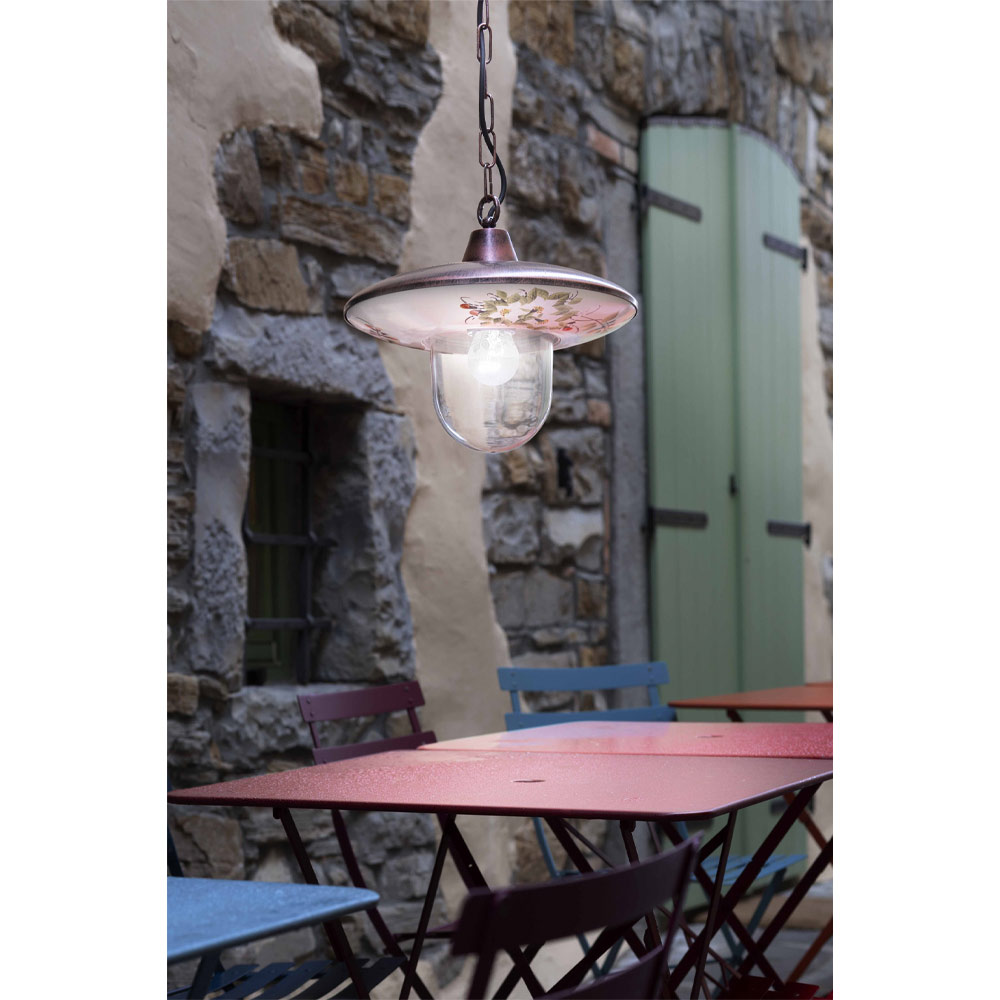 Această lampă suspendată pentru spațiul exterior este realizată în întregime din aluminiu negru cu abajur cupru și decorată cu flori pictate manual pentru un stil clasic și armonios între formă și culori.