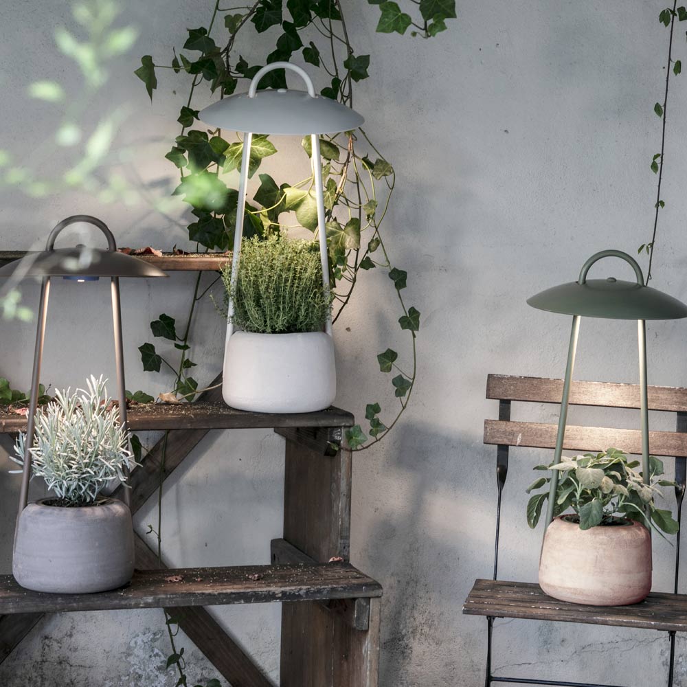 Designul simplu, dar rafinat, cu o bază de lut care acționează ca o vază, se potrivește perfect cu structura metalică elegantă care susține un abajur minimalist. Această combinație nu numai că îți luminează mediul, ci creează și un colț verde, ideal pentru plante mici sau ierburi aromatice.