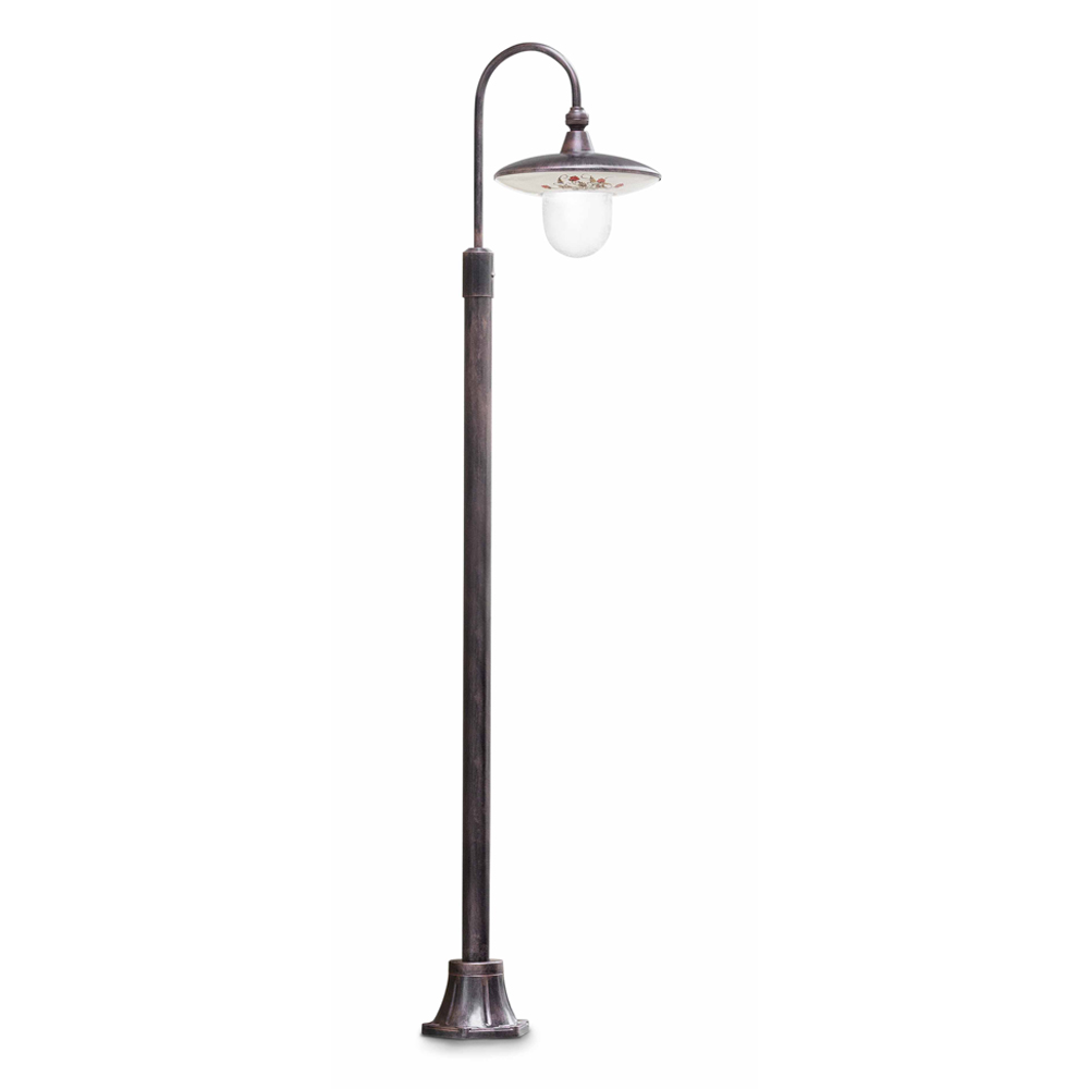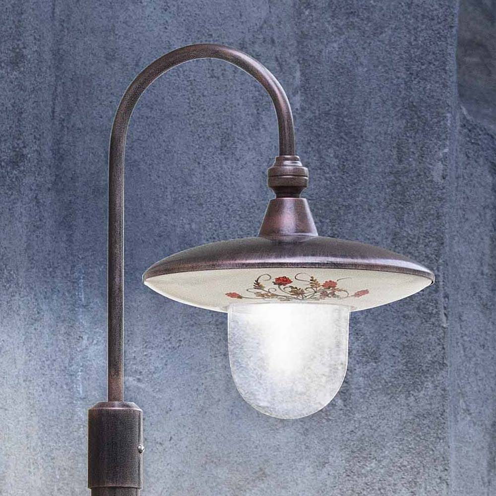 Această lampă de grădină este realizată în întregime din aluminiu negru cu abajur cupru și decorată cu flori pictate manual pentru un stil clasic și armonios între formă și culori.