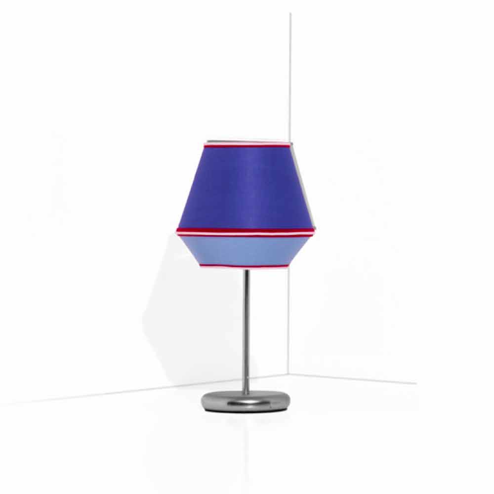 Made în întregime în Italia, această lampă de masă este compus dintr - o bază de metal cromat pe care este instalat albastru si lumina abajurului din bumbac albastru îmbogățit cu inserții roșii și albe.