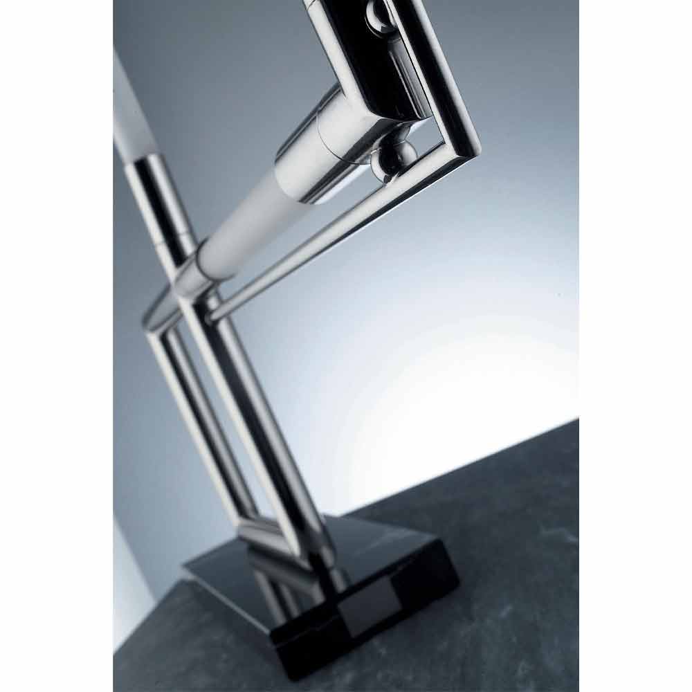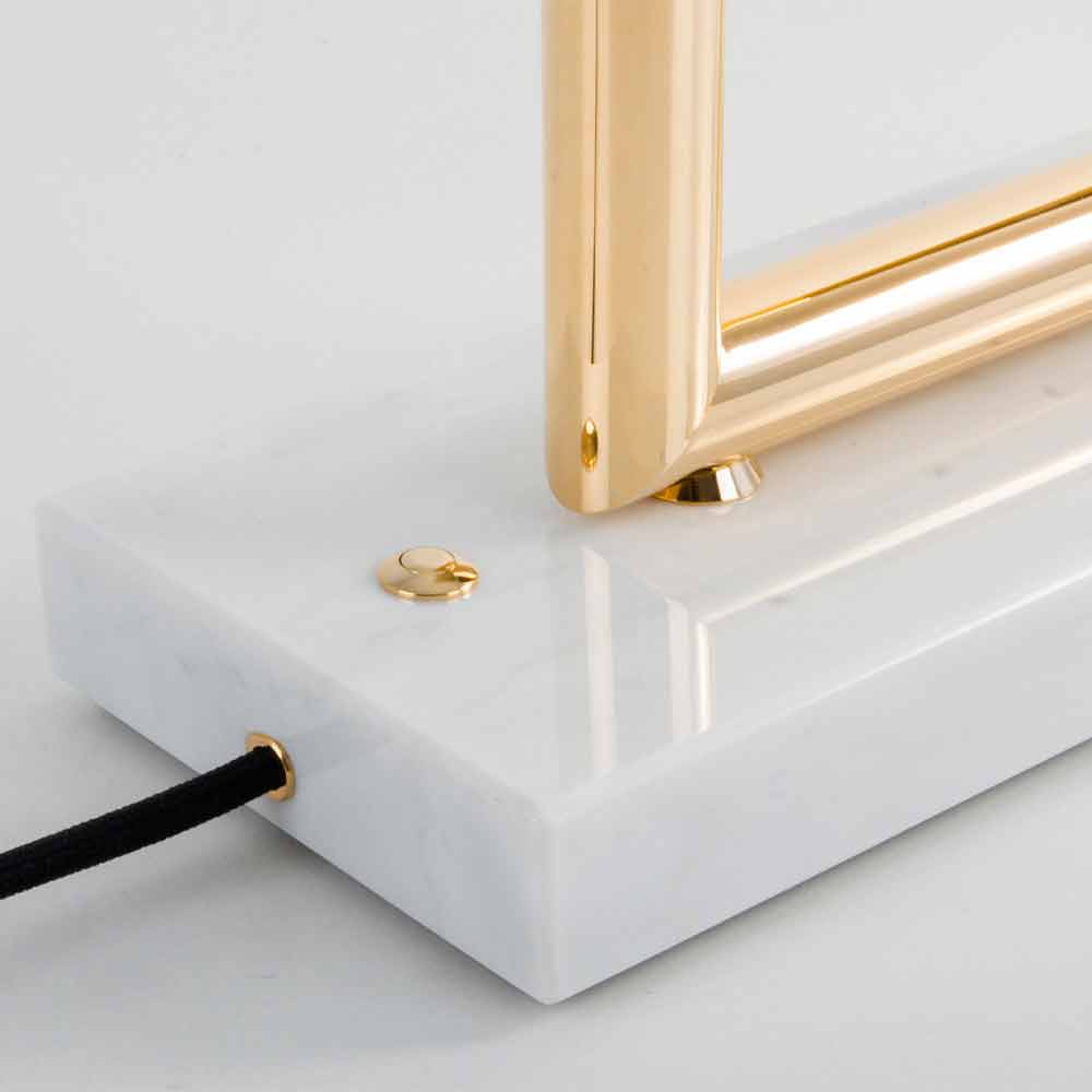 Lampă de masă fabricată în Italia cu structură din alamă lustruită , difuzor din rășină acrilică și bază din marmură completă cu cablu electric din țesătură neagră, buton de alimentare cu regulator de intensitate a luminii și surse LED integrate.