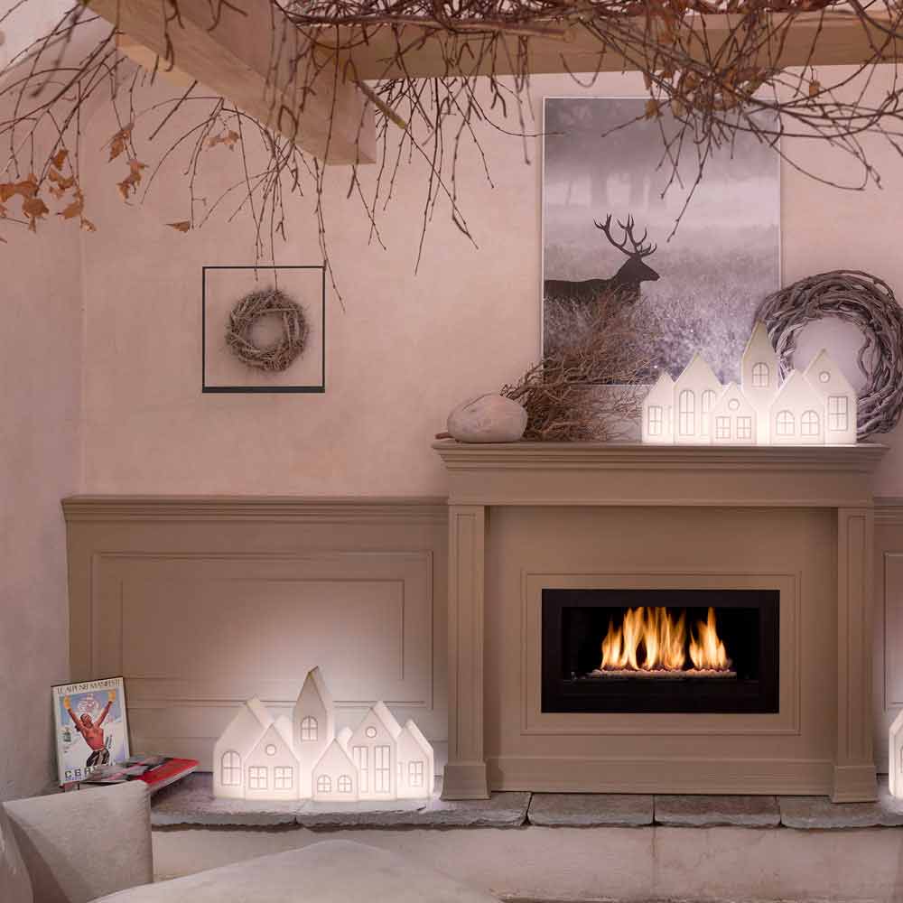 lampă de masă ajută la crearea spiritului Crăciunului datorită designului său în formă de pătuț cu un suflet puternic contemporan alcătuit din șase case, care amintește de stilul clasic al peisajelor tradiționale scandinave.