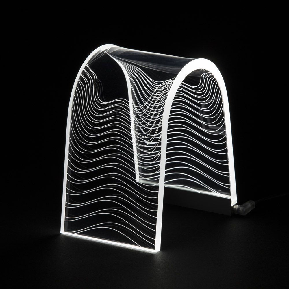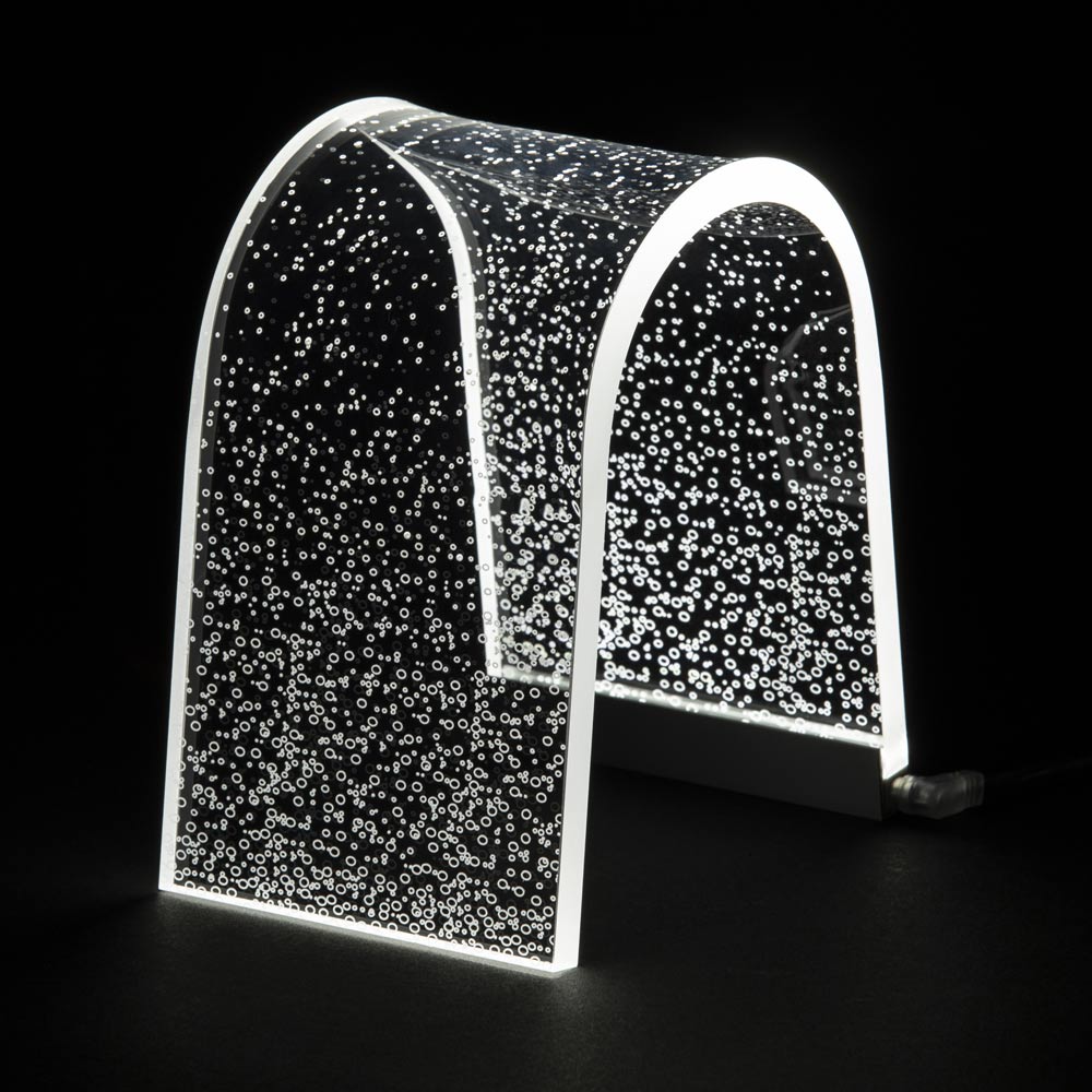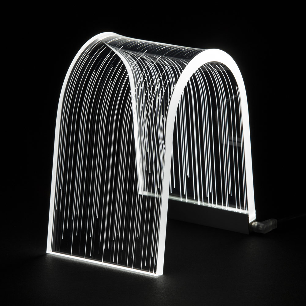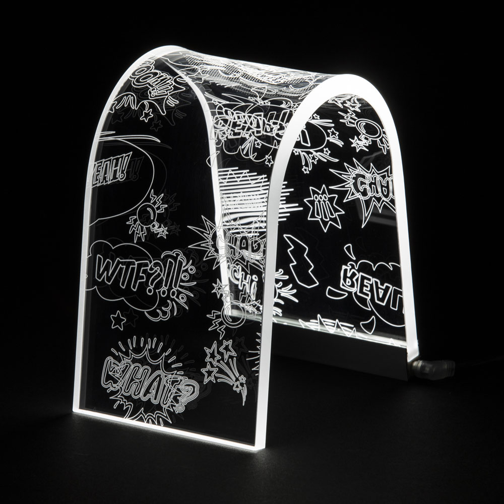Această lampă de masă este realizată în întregime din cristal acrilic transparent cu decor gravat cu laser din diverse motive. Se caracterizează prin forma sa de arc contemporană și modernă. Banda de led de la baza lumineaza intregul corpul lampii si gravurile acesteia care ilumineaza mediul creand o atmosfera scenografica si eficienta. Cristalul acrilic este polimerul metacrilat care se caracterizează prin puritatea transparenței sale care depășește cristalul natural.