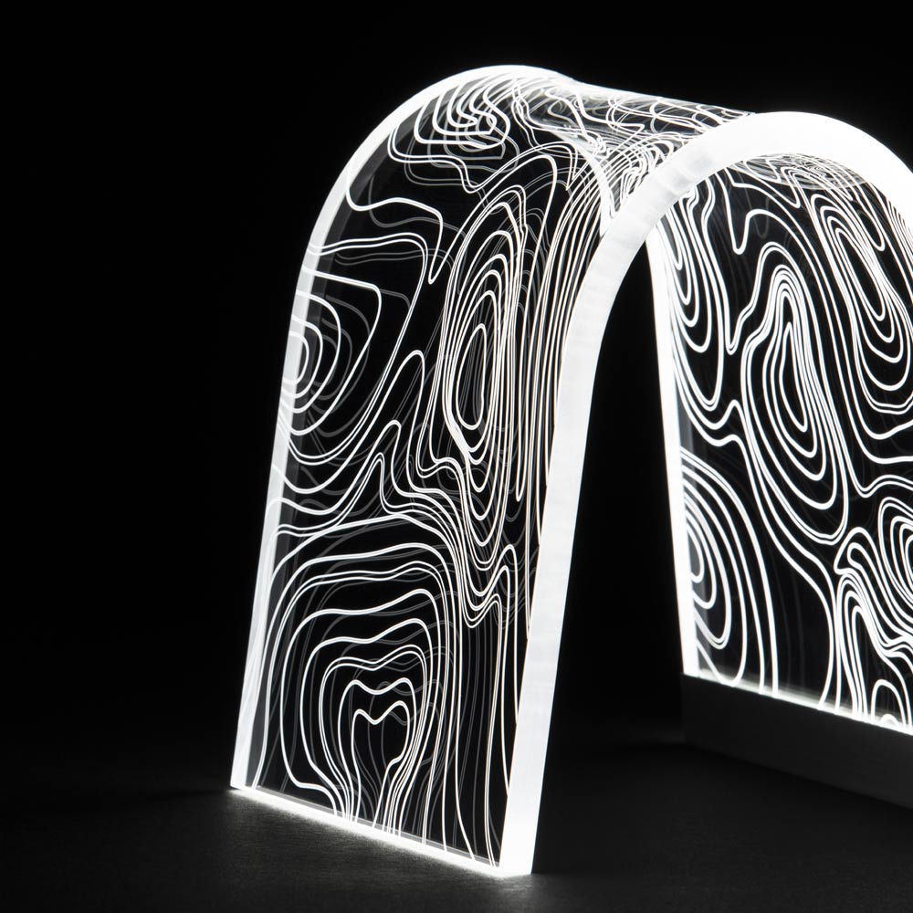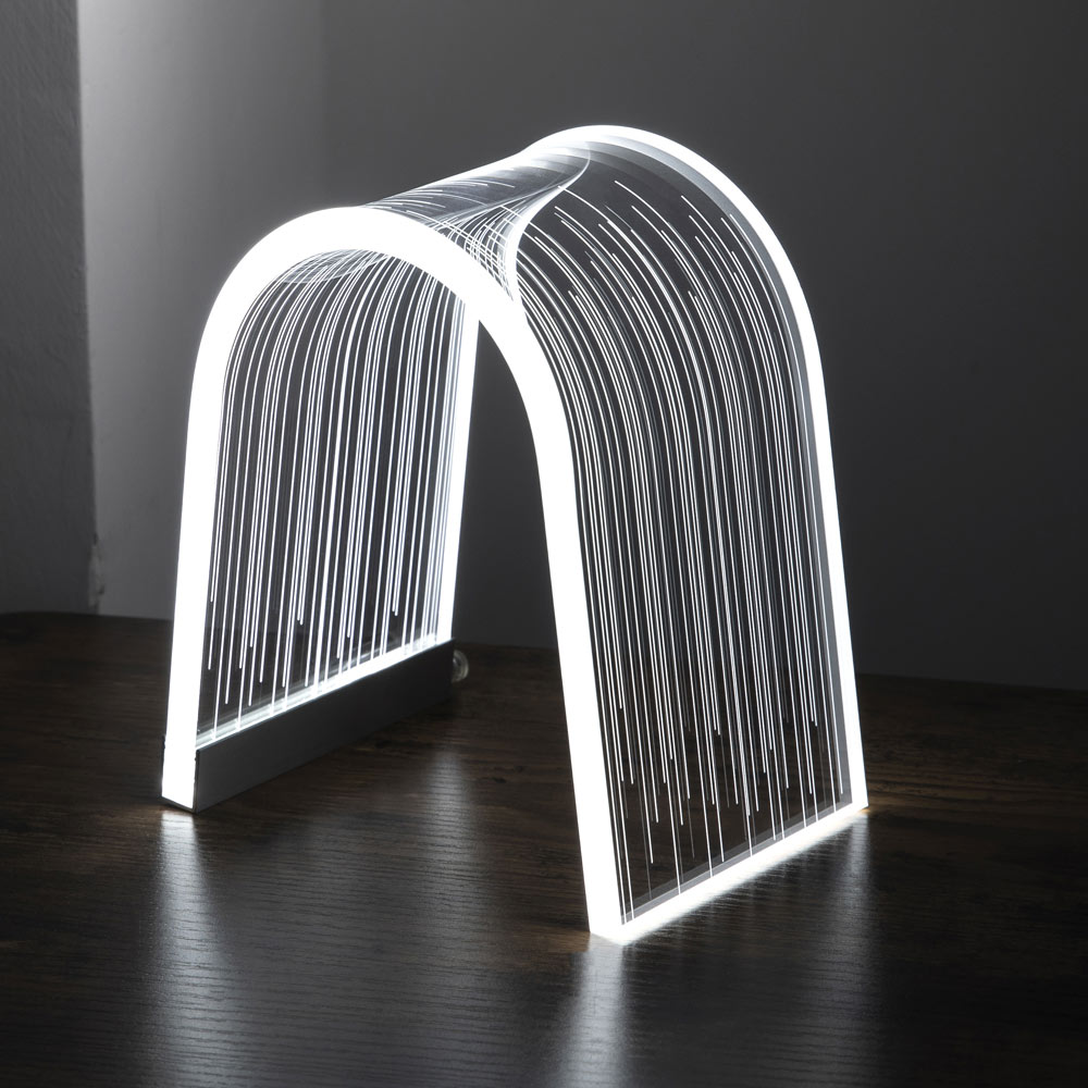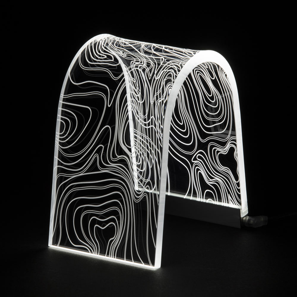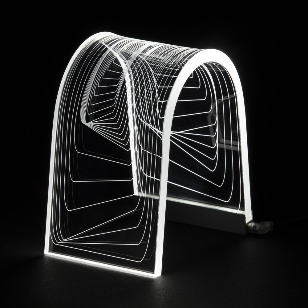 Această lampă de masă este realizată în întregime din cristal acrilic transparent cu decor gravat cu laser din diverse motive. Se caracterizează prin forma sa de arc contemporană și modernă. Banda de led de la baza lumineaza intregul corpul lampii si gravurile acesteia care ilumineaza mediul creand o atmosfera scenografica si eficienta. Cristalul acrilic este polimerul metacrilat care se caracterizează prin puritatea transparenței sale care depășește cristalul natural.