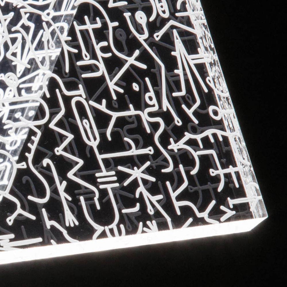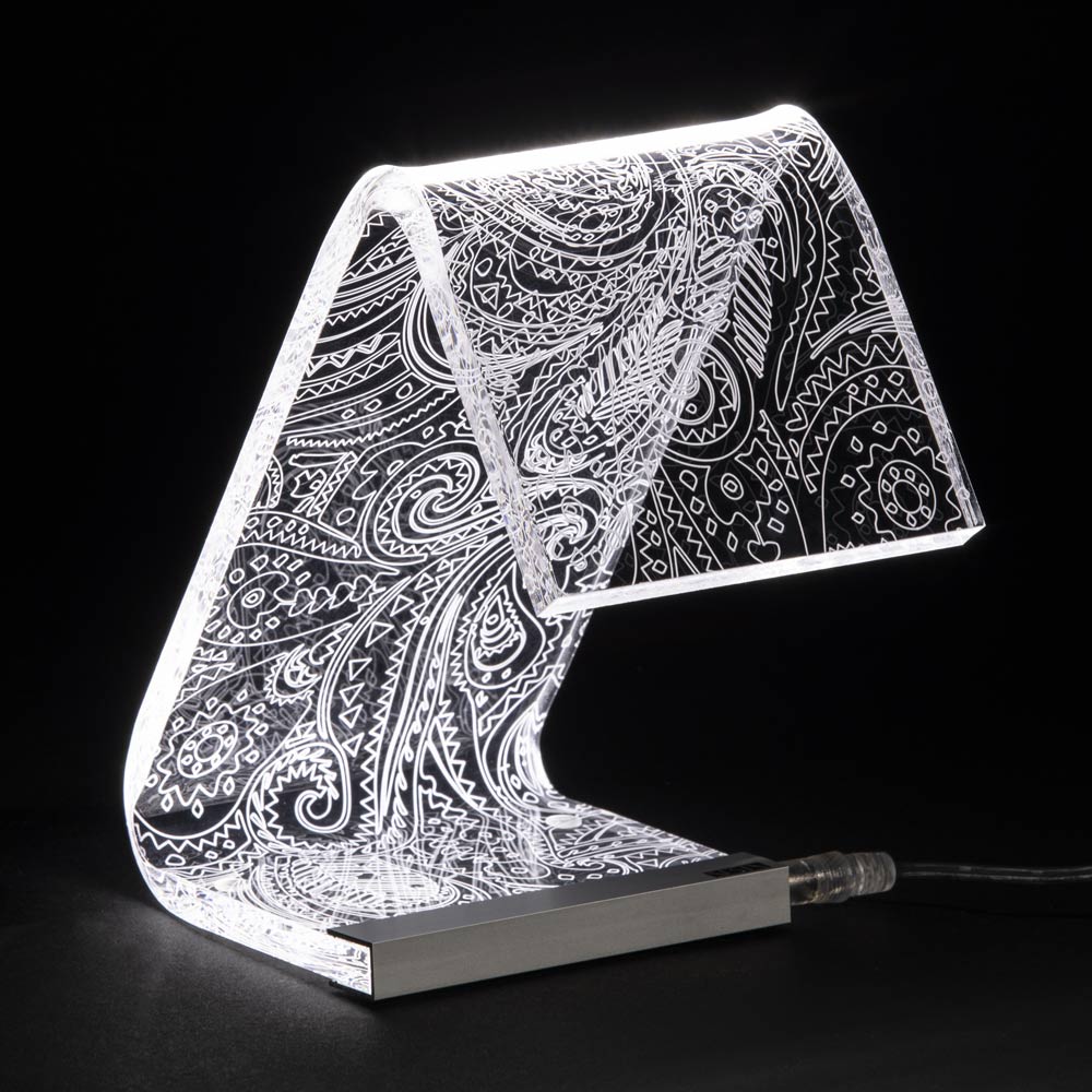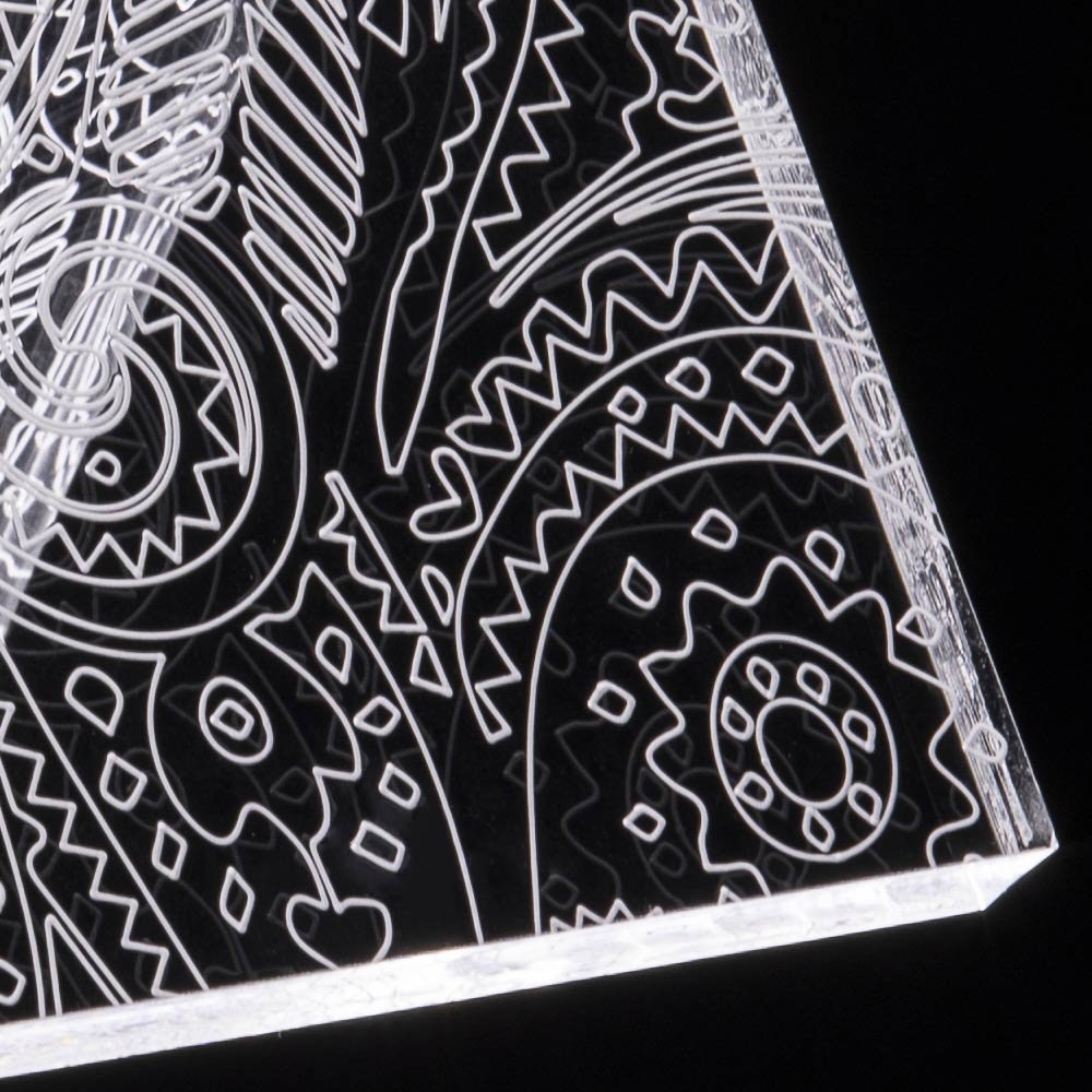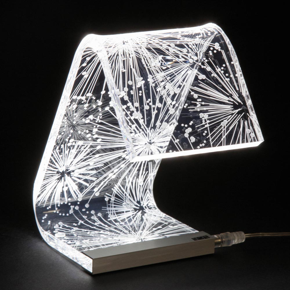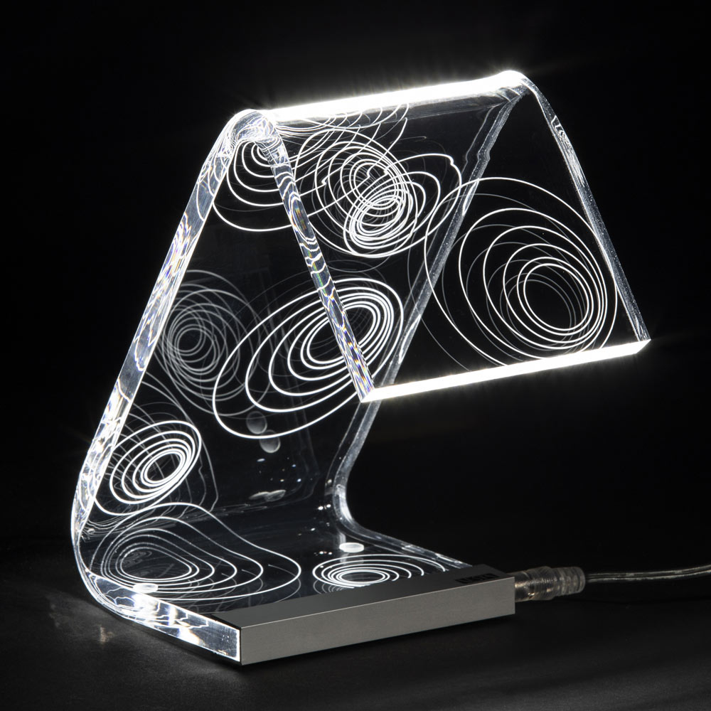 Lampa de masa din cristal acrilic transparent cu decoratiuni laser, 2 marimi fabricata in Italia.