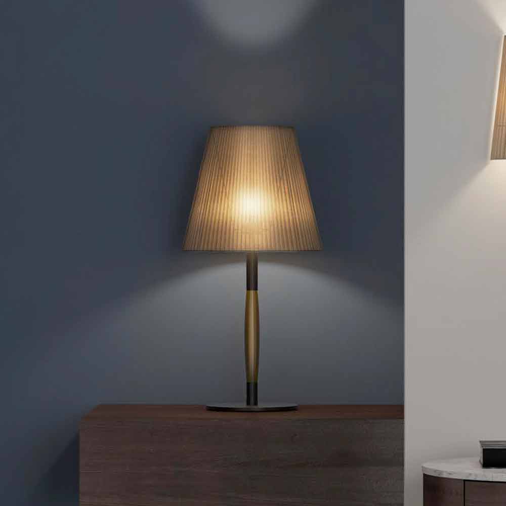 Lampă de masă din metal și lemn cu abajur modern din organza Made in Italy.