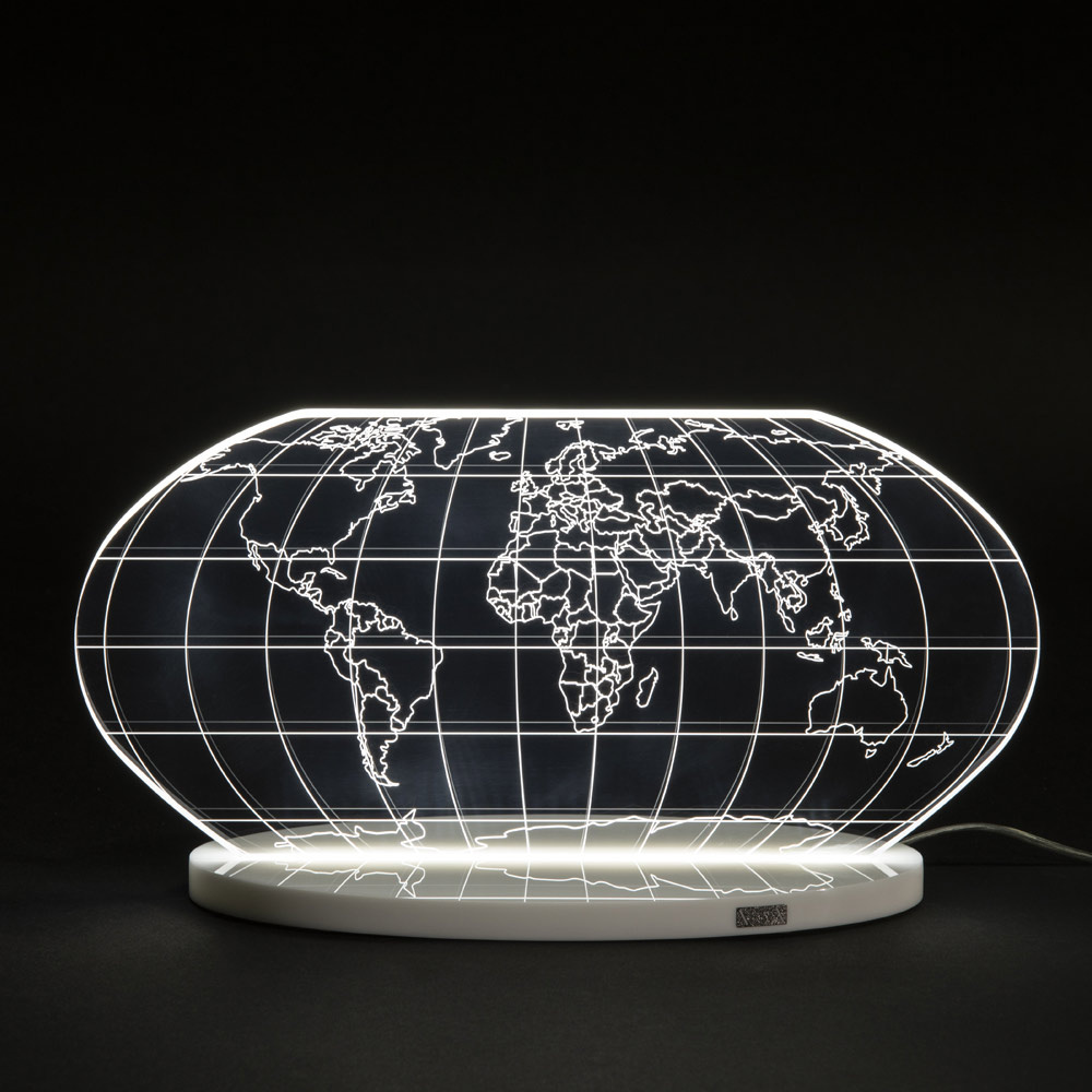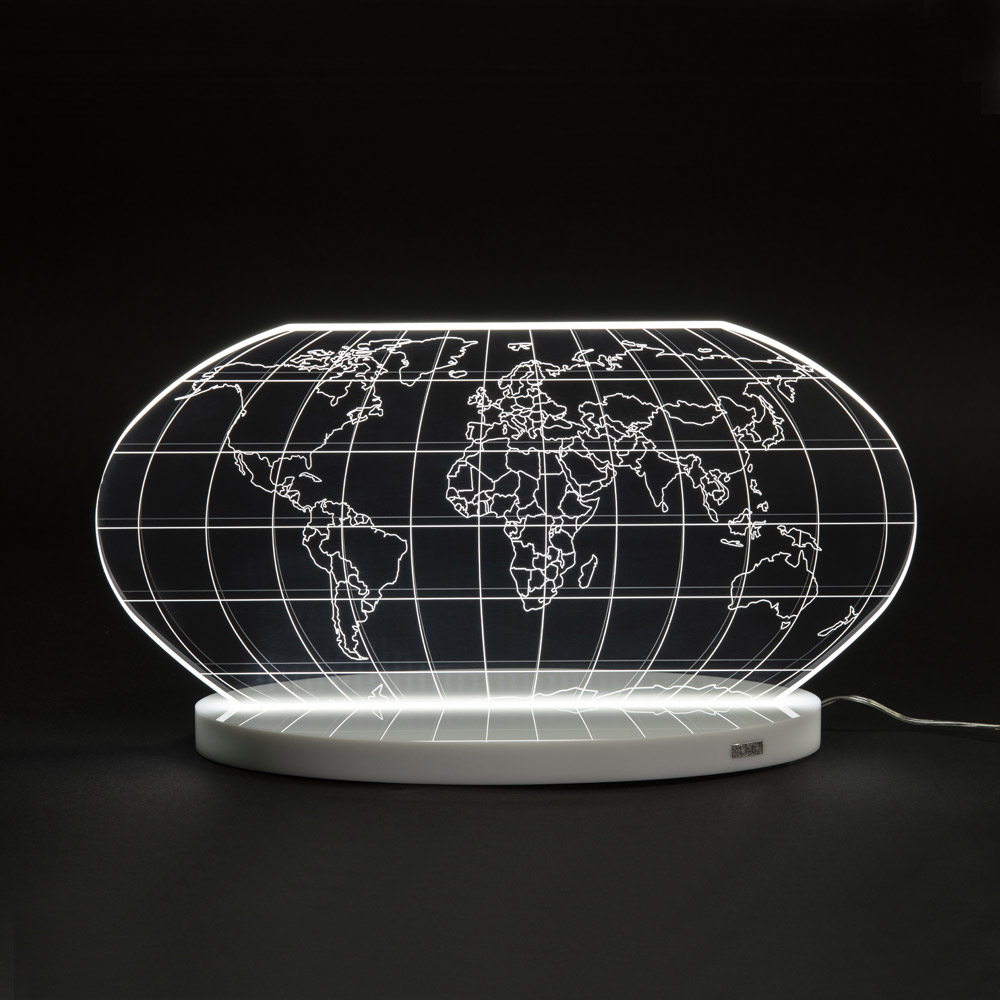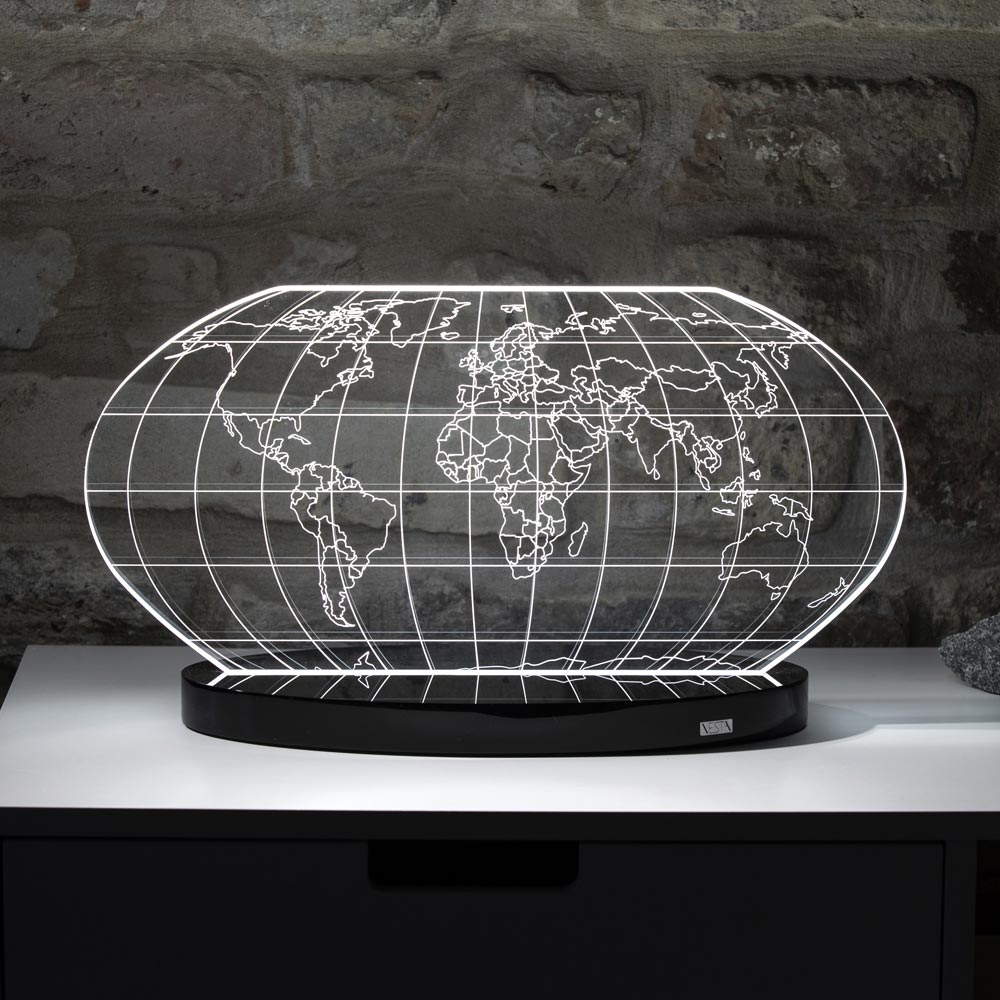 Lampa de masa din cristal acrilic transparent si harta lumii gravata cu laser, 2 dimensiuni fabricata in Italia.