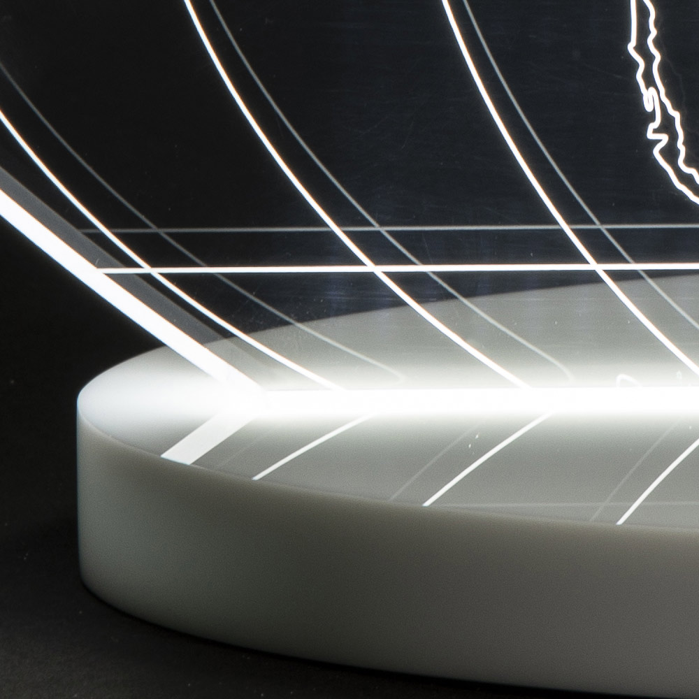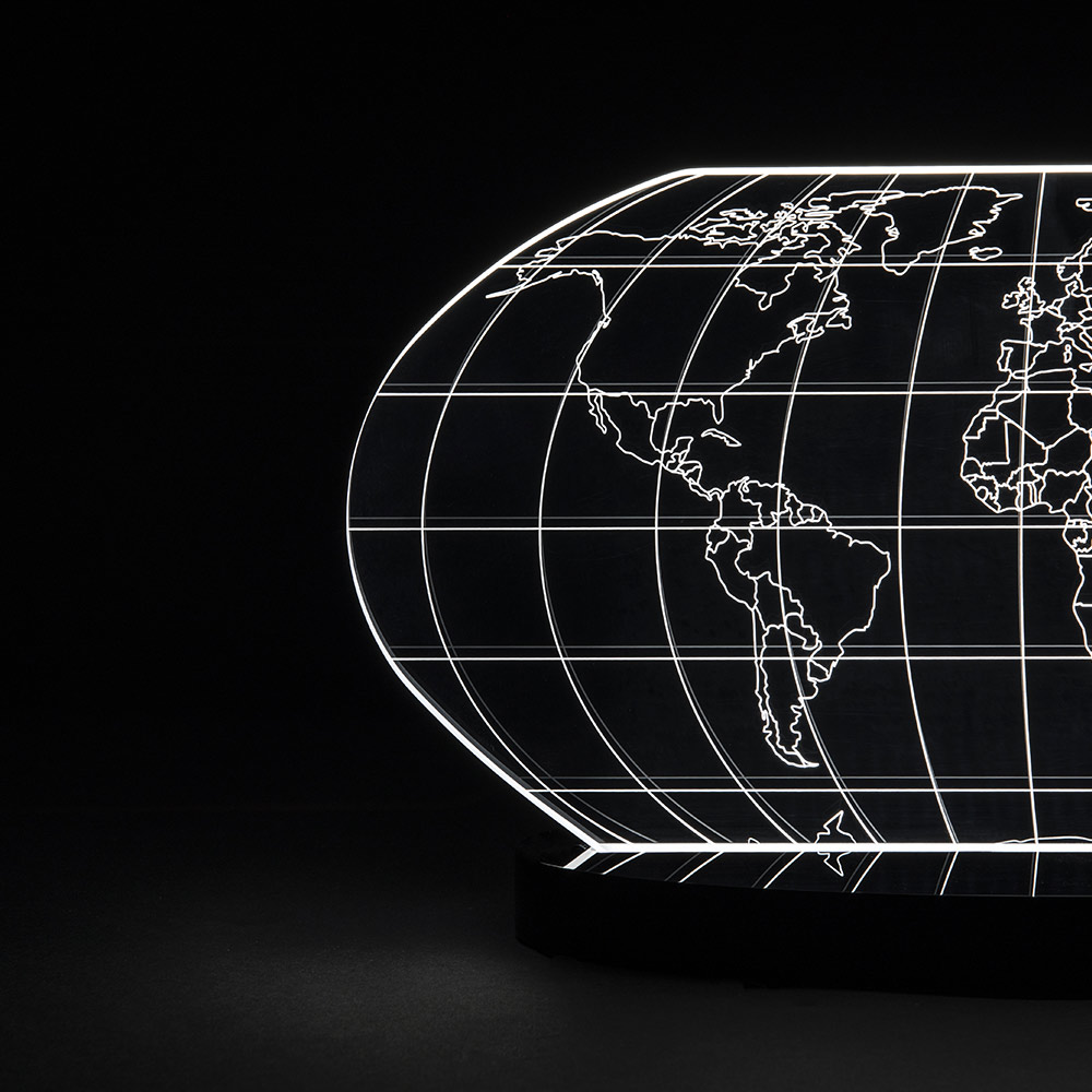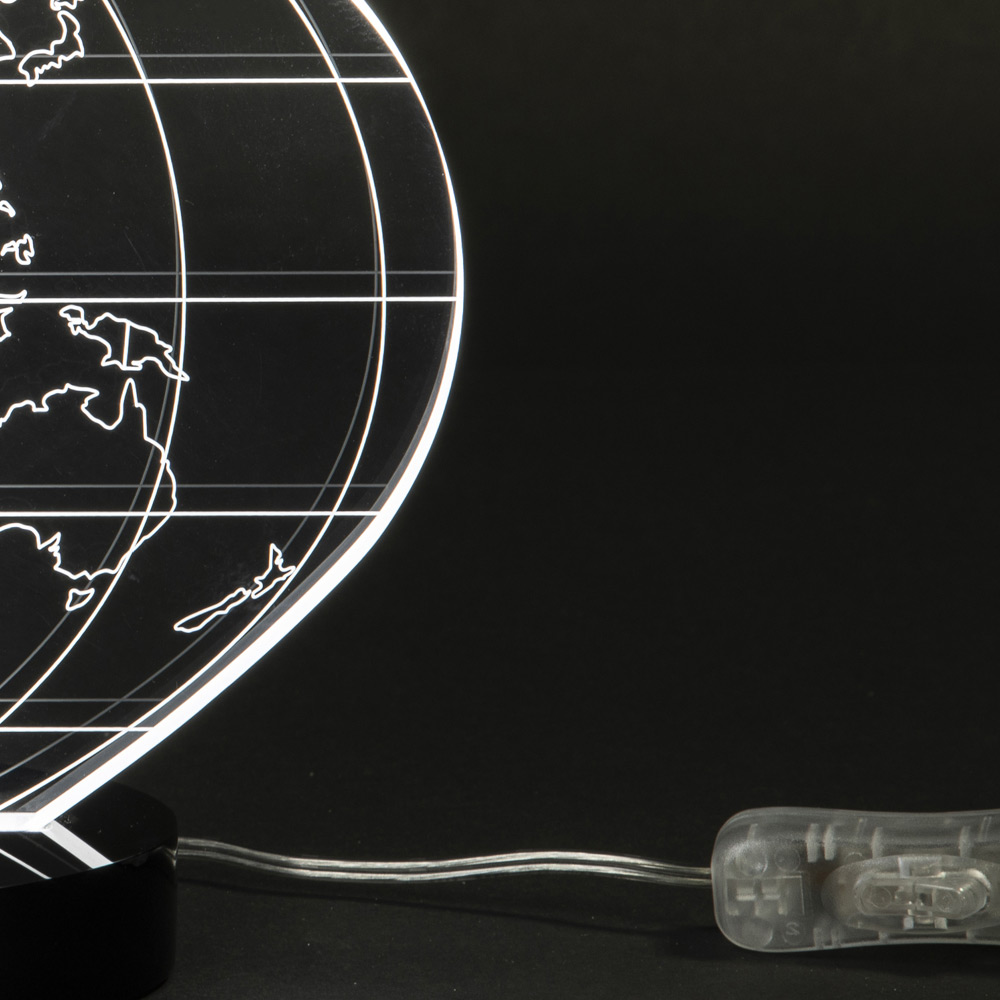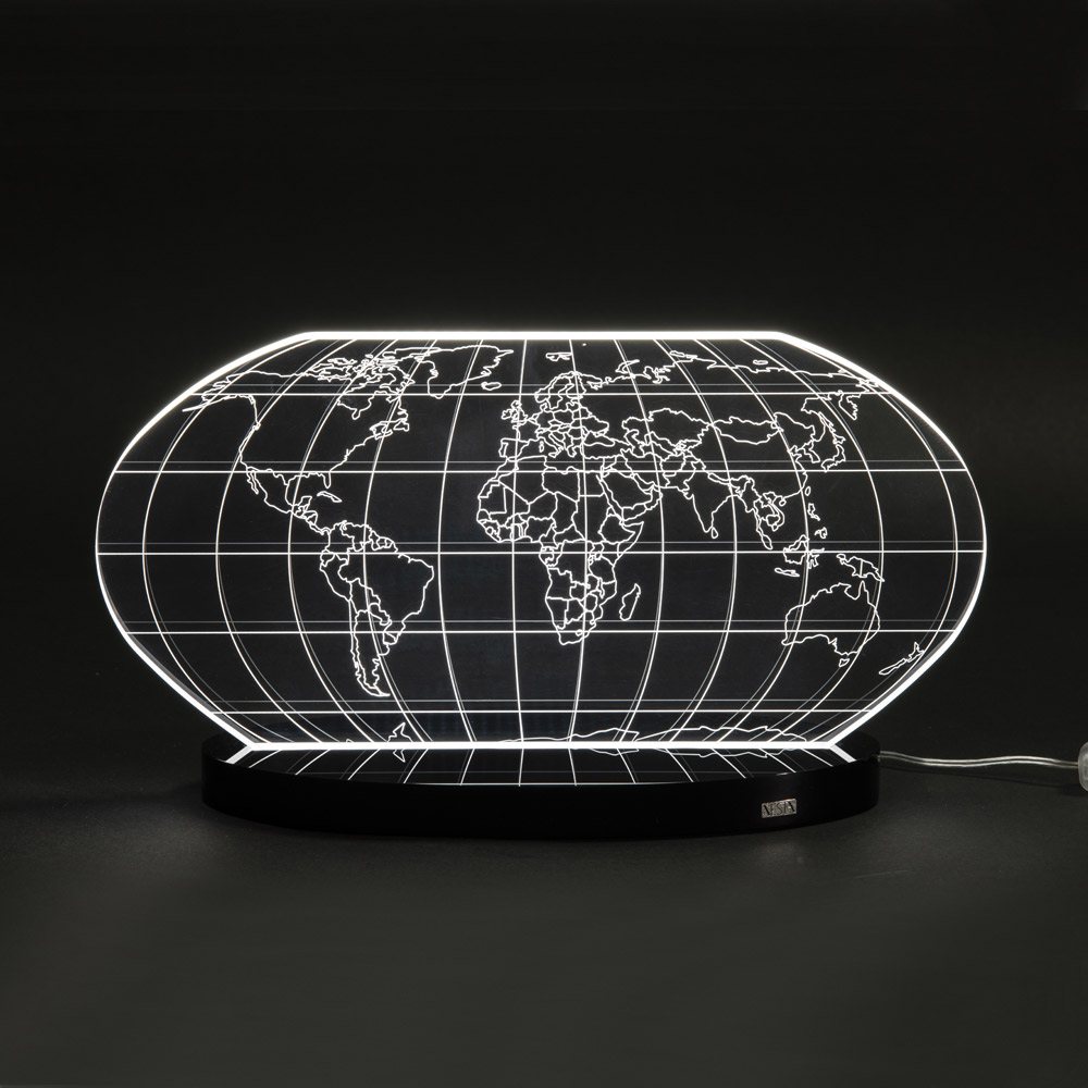 Lampa de masa din cristal acrilic transparent si harta lumii gravata cu laser, 2 dimensiuni fabricata in Italia.