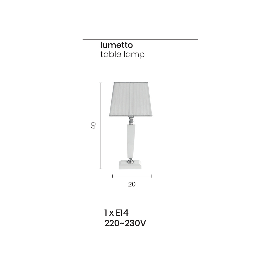 Capabilă să caracterizeze mediul înconjurător, această lampă de masă este compusă dintr-o bază pătrată albă , două elemente pătrate din sticlă albă lucrată manual și un abajur din material alb cu efect plisat.