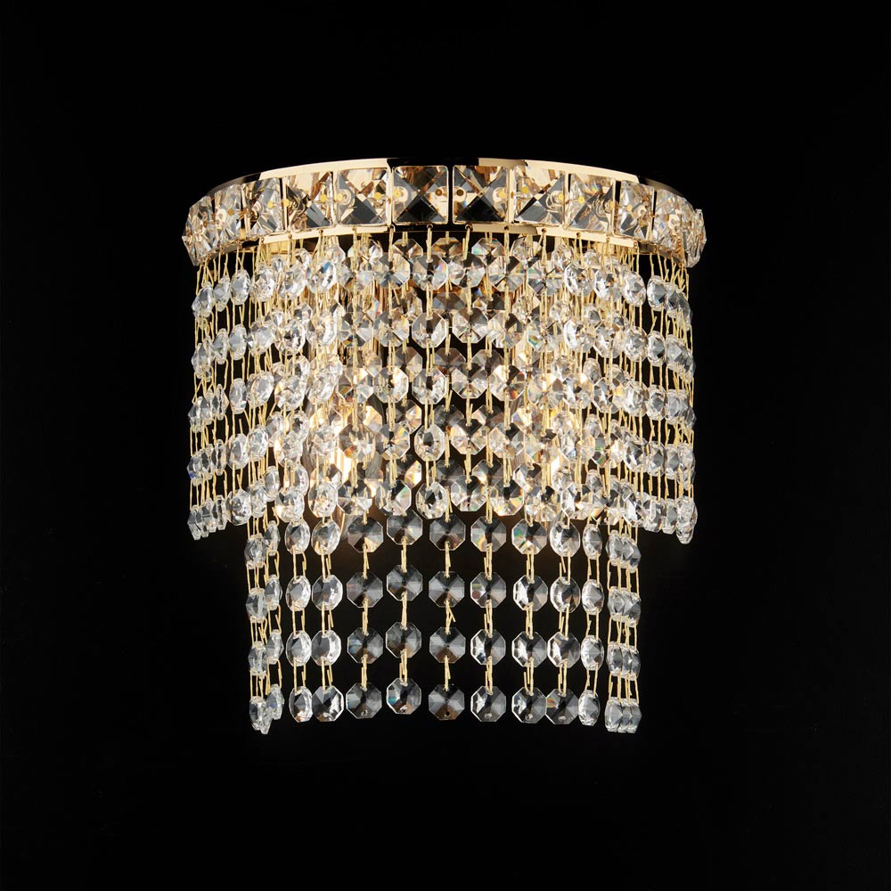 Elegantă și orbitoare, această aplică de perete de lux din fier și alamă placată cu aur, cu pietre, este un element de iluminat rafinat, conceput pentru a înfrumuseța pereții cu o lumină caldă și învăluitoare. Structura compactă, înfrumusețată cu cascade de pietre luminoase , creează un joc sugestiv de reflexii care conferă încăperii o atmosferă sofisticată și fermecătoare.