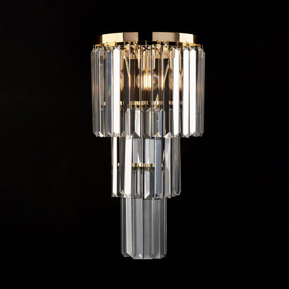 Elegantă și dramatică, această aplică de perete de lux din fier și alamă placată cu aur, cu pietre, este un element de iluminat rafinat, conceput pentru a înfrumuseța pereții cu o lumină caldă și învăluitoare. Structura verticală, dezvoltată pe mai multe niveluri, este înfrumusețată cu elemente transparente din pietre , care creează un joc sofisticat de reflexii, conferind profunzime și caracter spațiului.