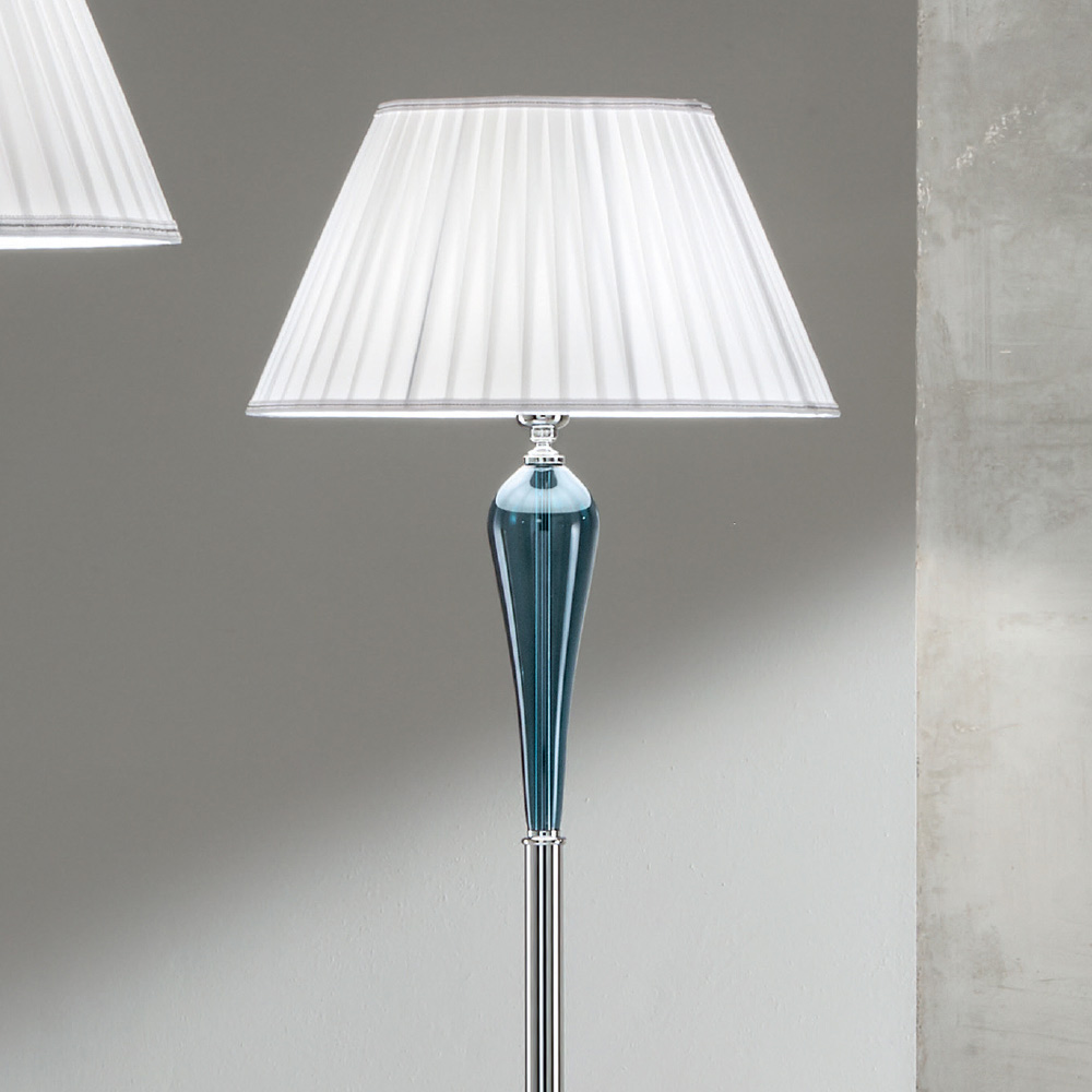 Această lampă de podea este compusă dintr-o bază rotundă din metal cromat împodobită cu motive din sticlă transparentă colorată.