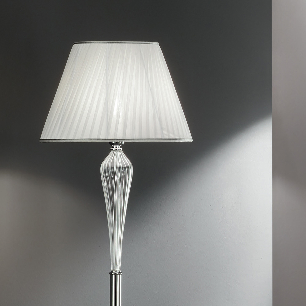 Caracteristica particulară este dată de motivele prețioase produse din sticlă lucrată manual în Italia cu efect „rigaton” care dezvăluie miezul metalic și care susține abajurul din material alb cu efect plisat .