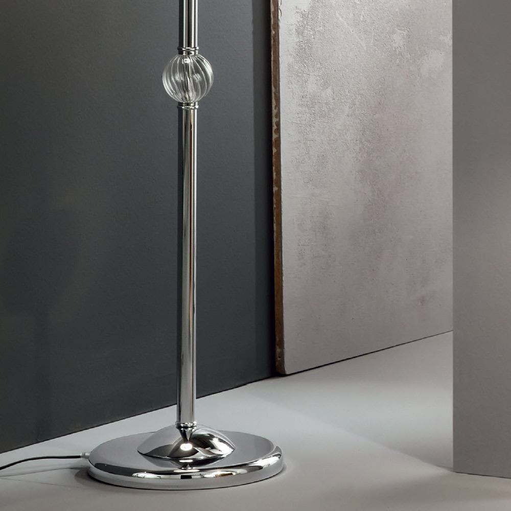 Această lampă de podea în stil clasic este realizată cu o bază rotundă și o parte a structurii din metal cromat.