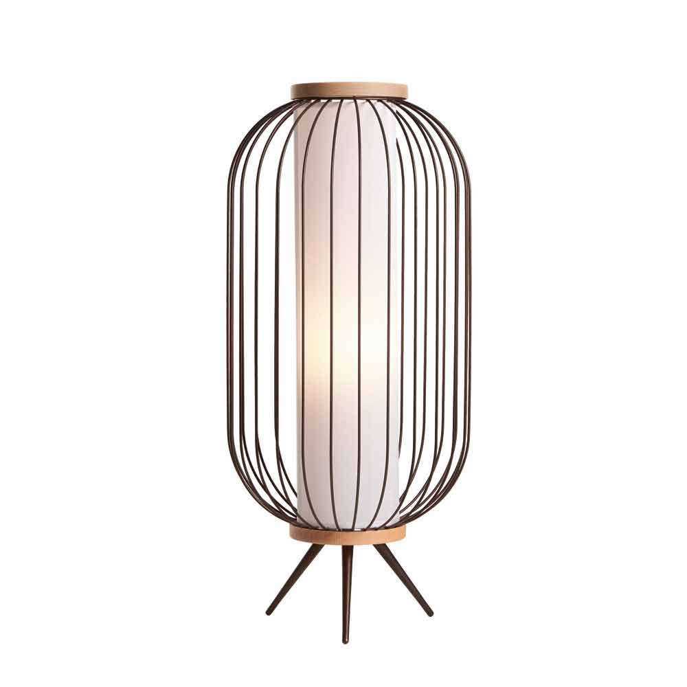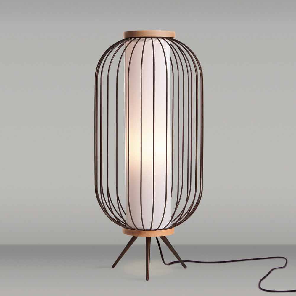 Lampa de podea din tija de oțel profilat și vopsit cu pulberi epoxidice. Cele două benzi care închid corpul sunt rotunjite din lemn natural. Versiunile la sol pot fi de asemenea utilizate ca svuotatasche fie fără abajur. Sursa de lumină LED-uri a versiunii cu mâner este echipat cu o baterie reîncărcabilă cu o autonomie dicirca 6 ore.