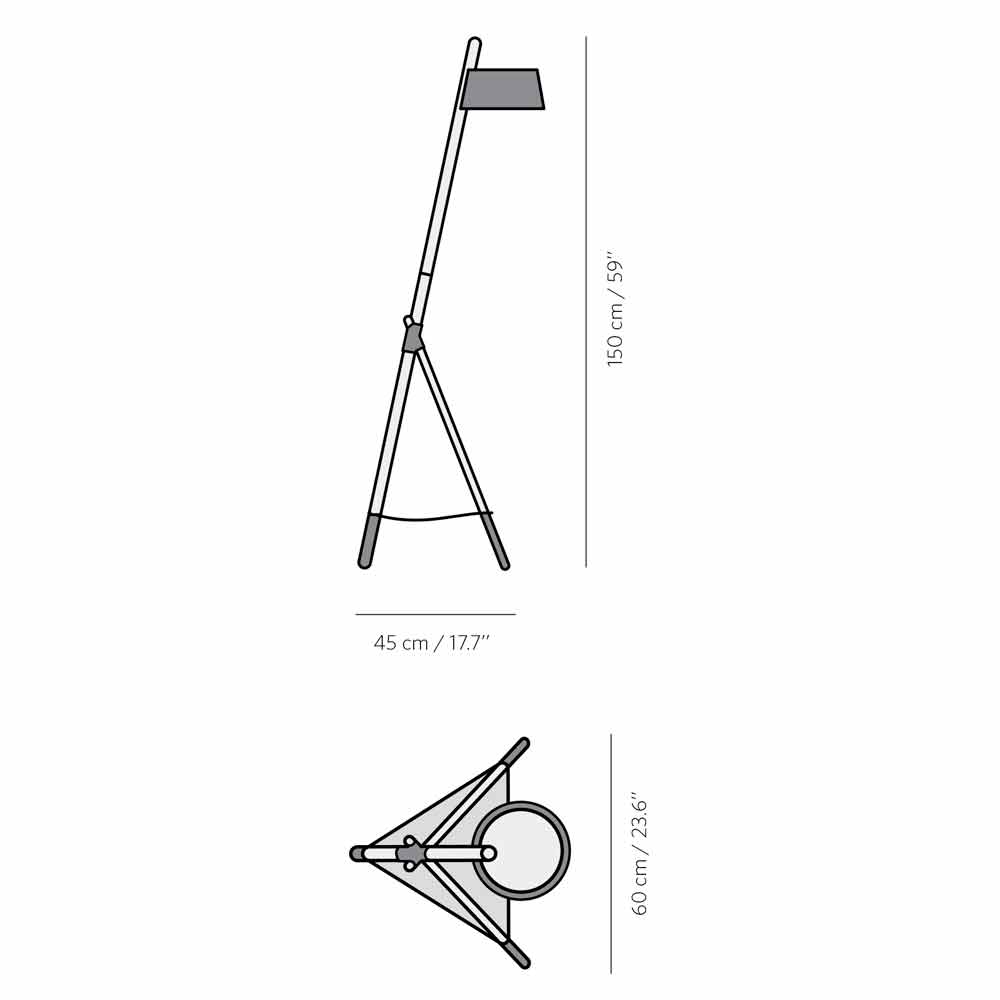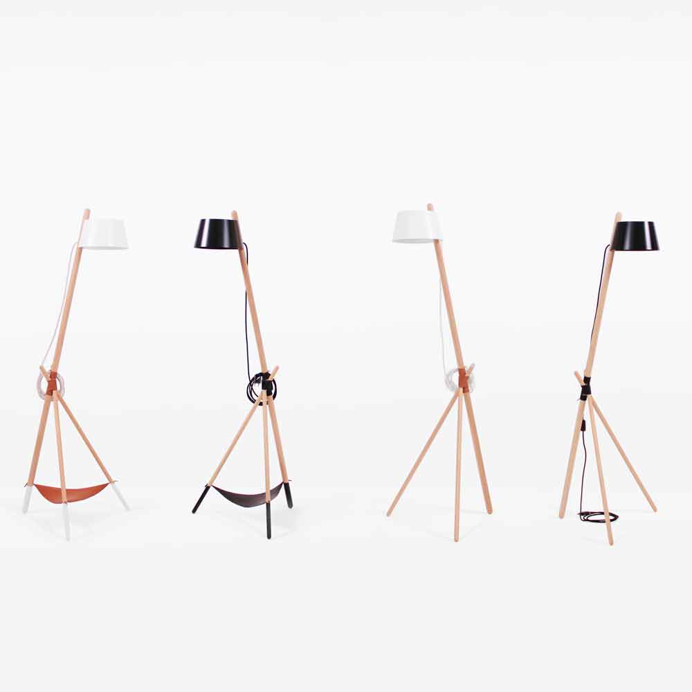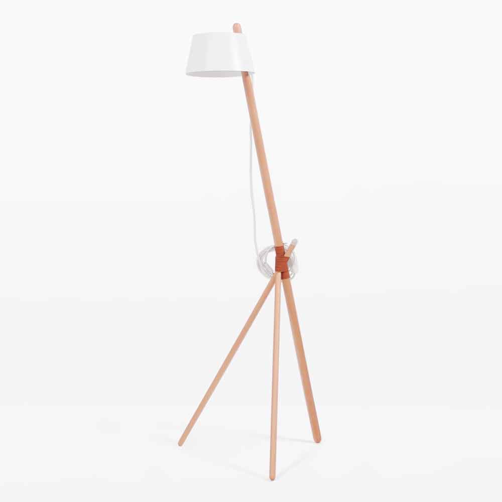 stil modern capabil să acopere rolul mai tradițional al sursei de lumină a camerei, dar și un element pur decorativ capabil să atragă atenția. Structura sa este compusă dintr-o bază de trei picioare din lemn masiv de fag, ținută împreună de un cablu din piele vegană, în timp ce abajurul este din metal lăcuit și are un difuzor 100% bumbac care creează o atmosferă caldă și primitoare. Lampa este disponibilă și în variantă cu un raft practic și funcțional, realizat tot din piele vegană, ideal pentru plasarea obiectelor precum cărți sau reviste pe care să le aveți mereu la îndemână.