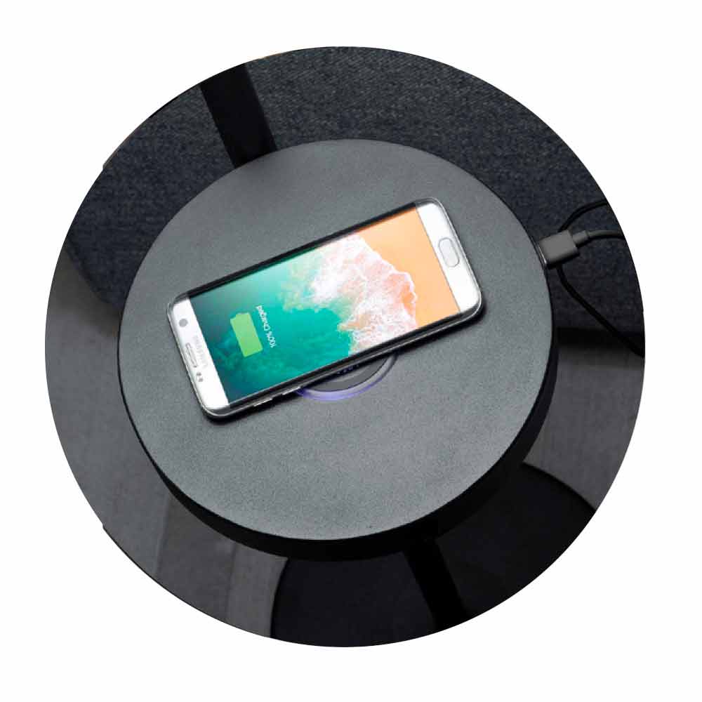 Ceea ce face acest complement unic este funcționalitatea dată de capacitatea sa de a ilumina mediul într-un mod omogen, dar mai ales de micul raft rotund echipat cu încărcare QI fără fir și port USB care vă permite să încărcați două dispozitive în același timp, rămânând așezat confortabil. pe cont propriu. canapea.