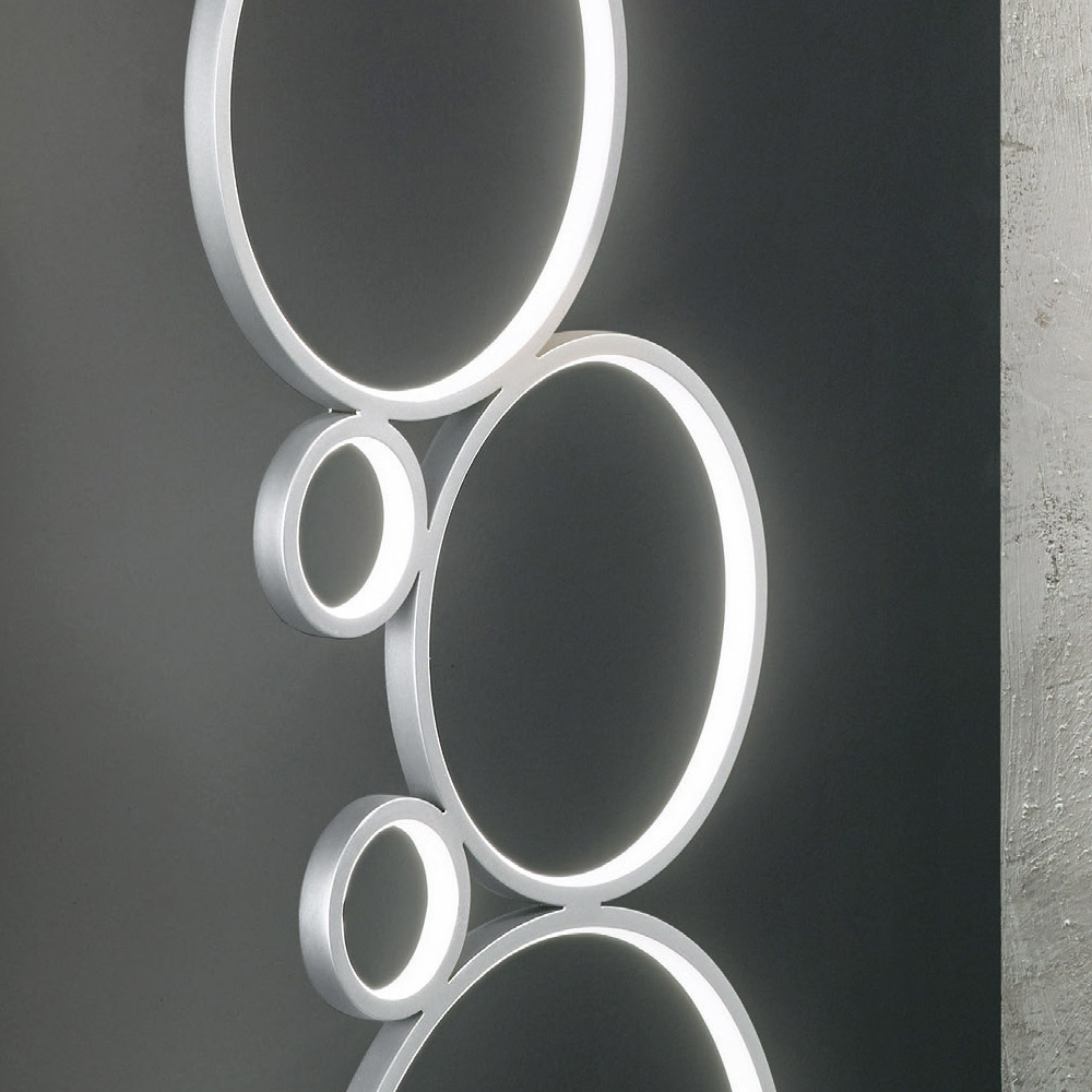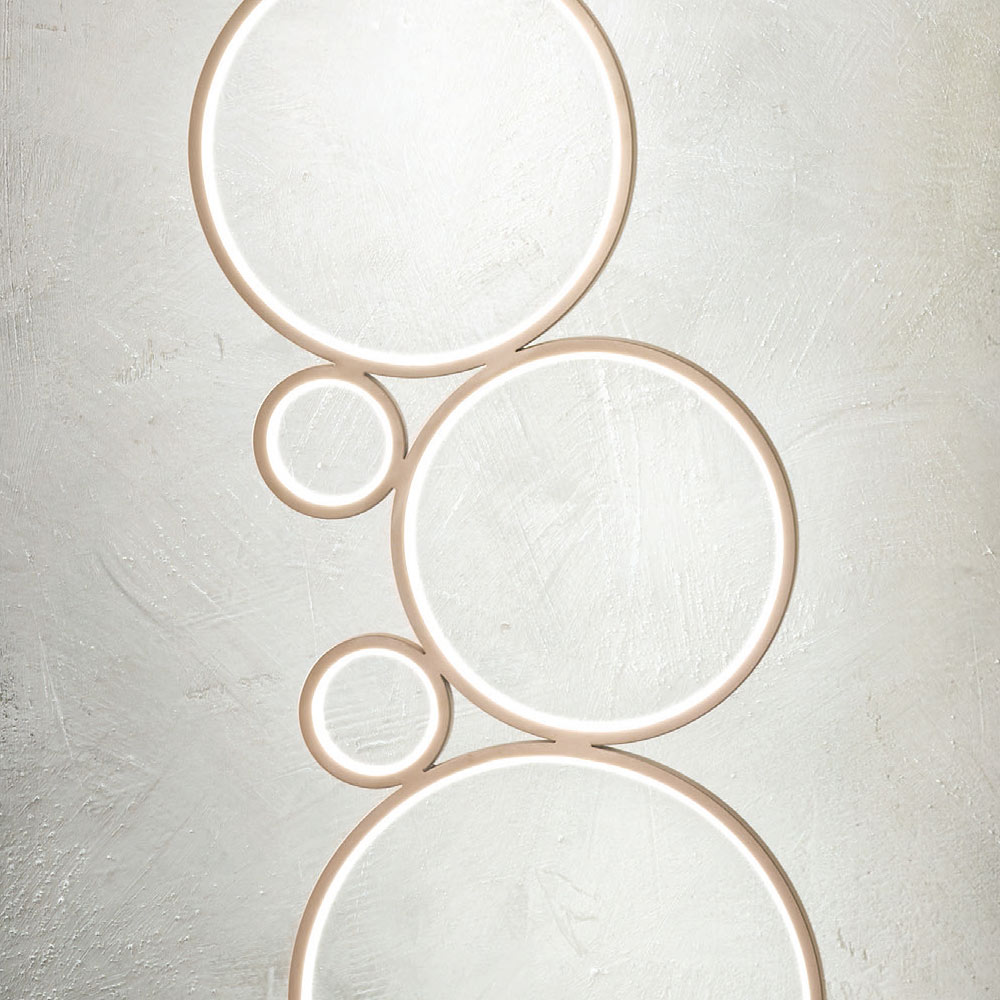 caracter versatil , care poate fi instalat în orice mediu casnic: intrare, bucătărie, living, dormitor. O compozitie originala alcatuita din cercuri de diferite marimi unite intre ele si acoperite la exterior de un difuzor alb-laptoasa care inchide banda LED creand efecte minunate de lumina pe pereti pentru un rezultat cu un