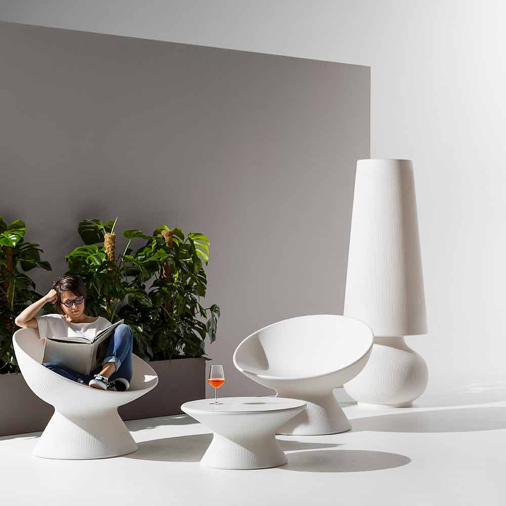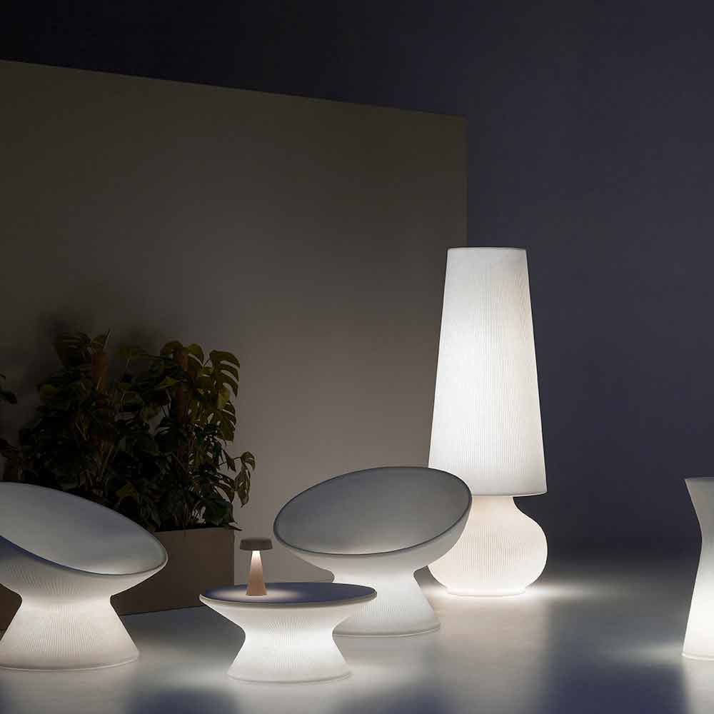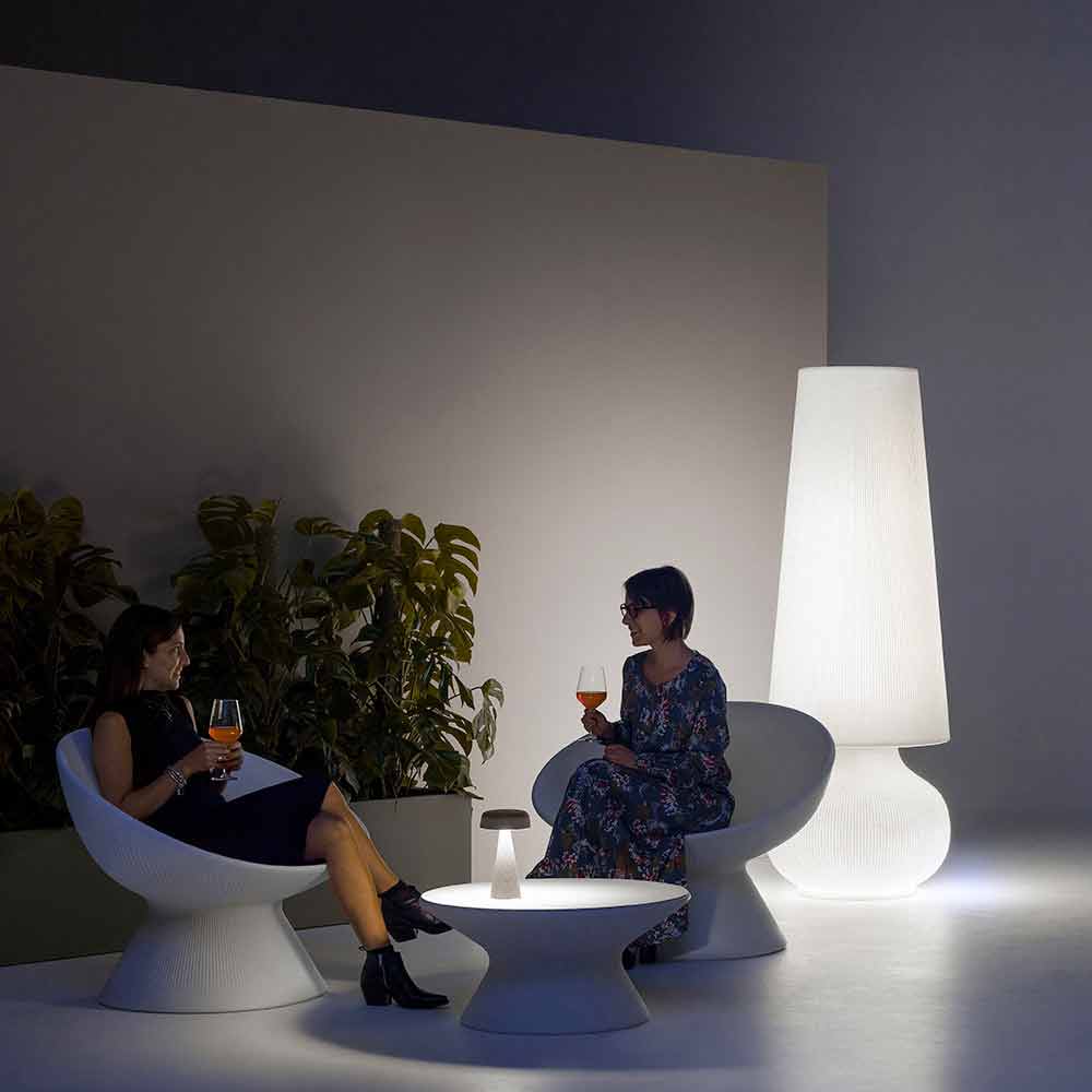 Lampă de podea pentru mobilarea spațiilor exterioare fabricate în Italia din polietilenă albă. Caracterizată printr-un design elegant și modern, această lampă cu prezență sculpturală este o soluție perfectă de amenajare pentru medii în aer liber, cum ar fi grădini și terase sau spații contractuale unde este necesar să îmbogățiți estetica cu o notă inovatoare și originală.
