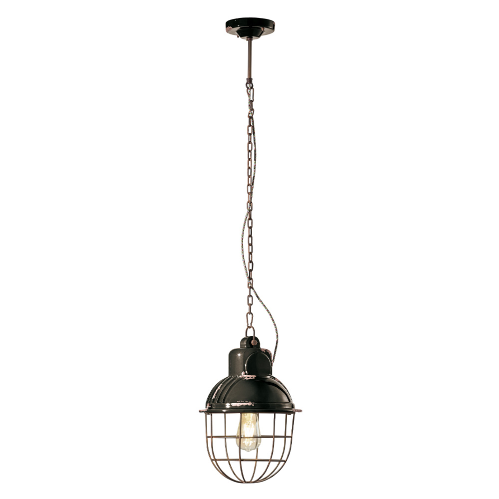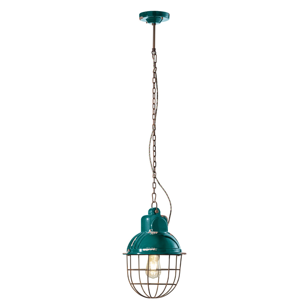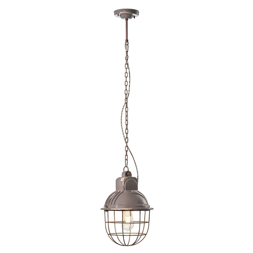 Lampa suspendata din ceramica si fier cu grilaj, diverse finisaje industriale fabricate in Italia de Ferroluce.