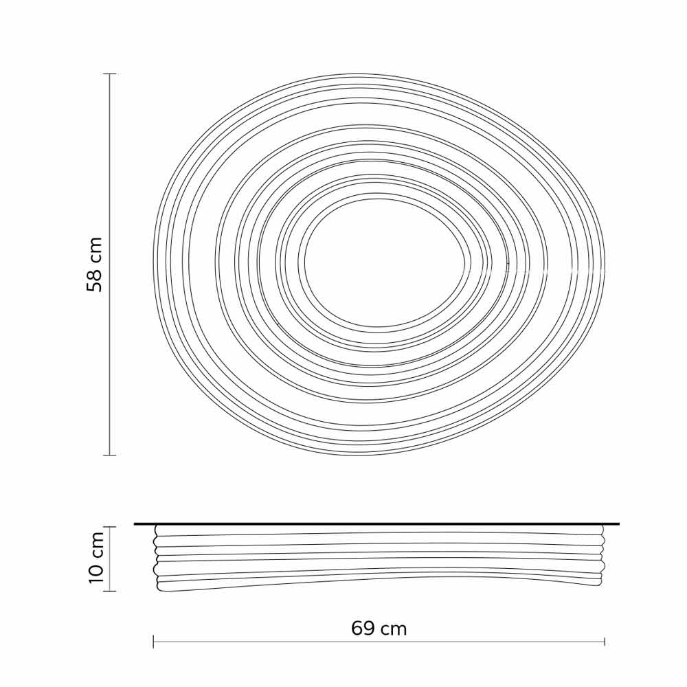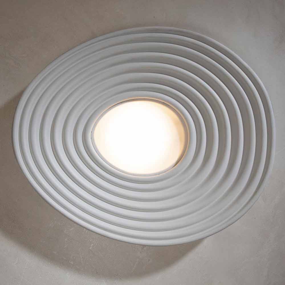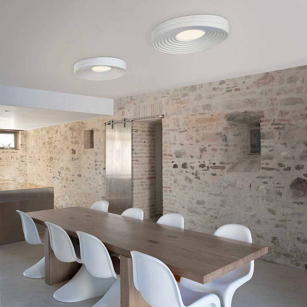 Această lampă de plafon originală și singulară creează minunate jocuri de lumină datorită părții centrale care garantează iluminarea directă și care se propagă pe suprafața lămpii, reflectându-se în cercuri concentrice.
