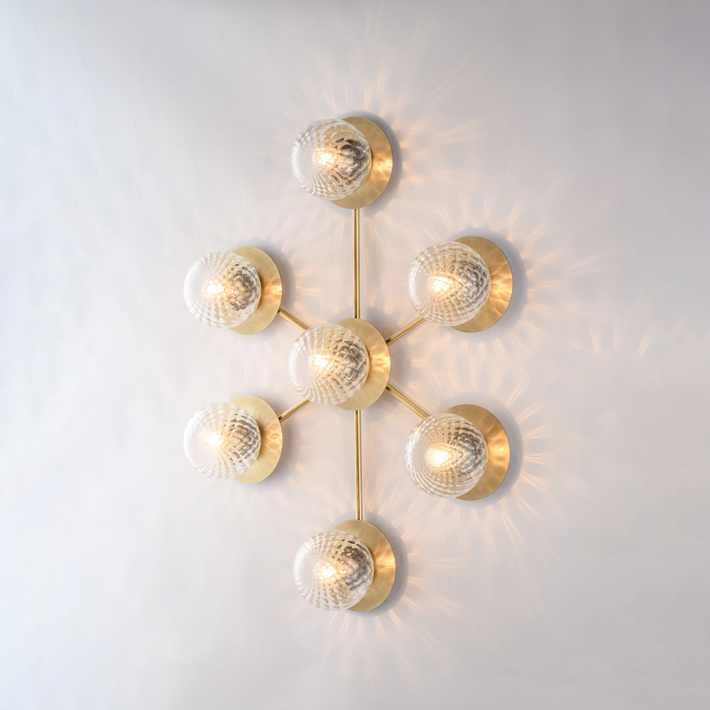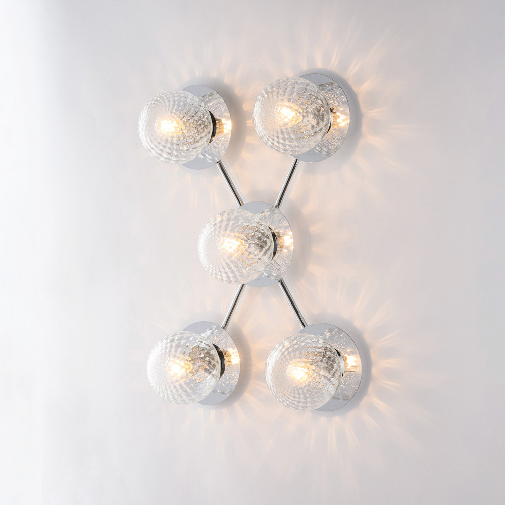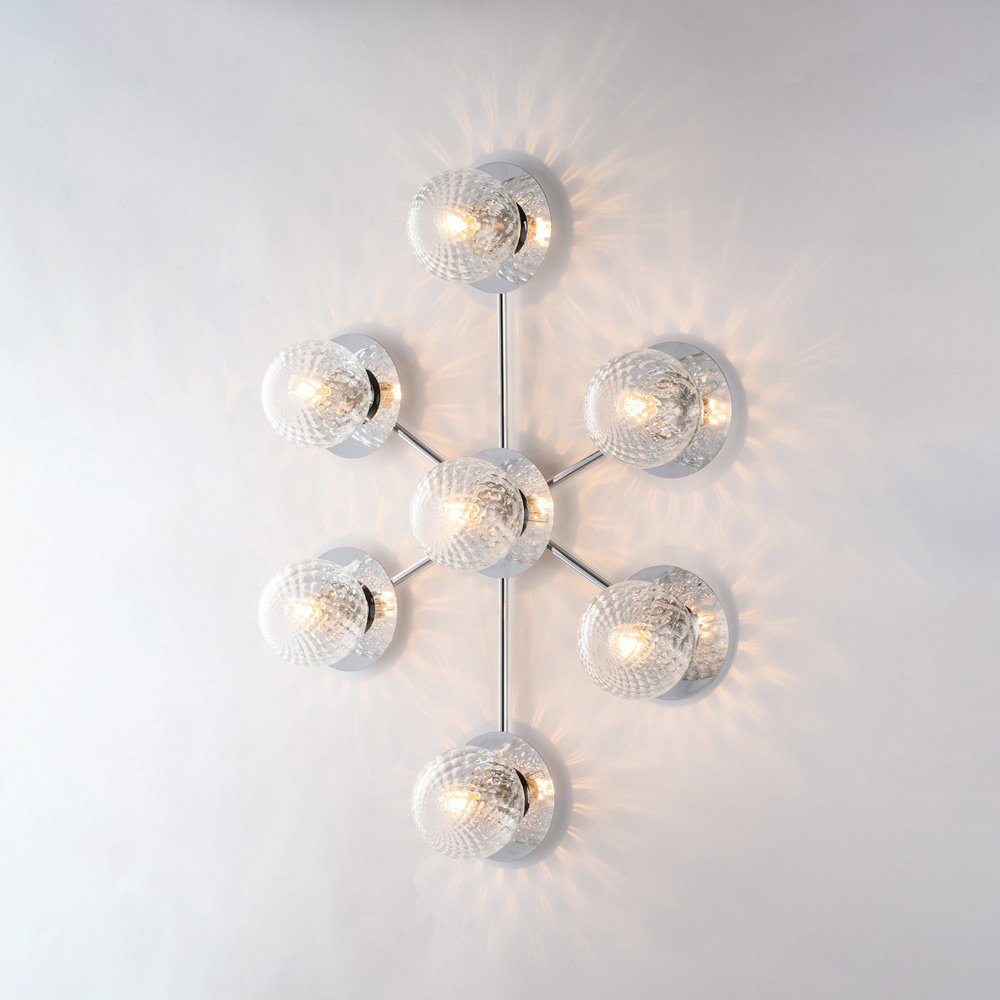 Dramatică și contemporană, această plafonieră din fier forjat, lucrată manual, se remarcă prin compoziția sa dinamică și modernă. Structura ramificată găzduiește difuzoare sferice din sticlă, aranjate într-un model echilibrat, creând un joc sugestiv de lumină și reflexii care pune în valoare tavanul și luminează uniform încăperea.
