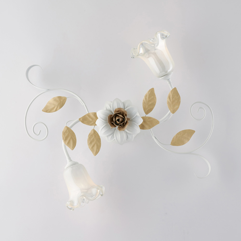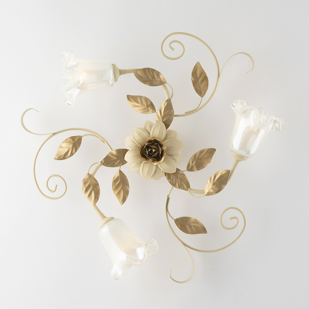 Rafinată și decorativă, această plafonieră clasică, lucrată manual, din fier lăcuit în culoarea fildeșului, este o creație luminoasă cu un puternic caracter romantic. Structura florală, înfrumusețată cu bucle sinuoase, frunze decorative și difuzoare din sticlă în formă de floare , conferă plafonului o eleganță ușoară și armonioasă, transformând lumina într-un adevărat element decorativ.
