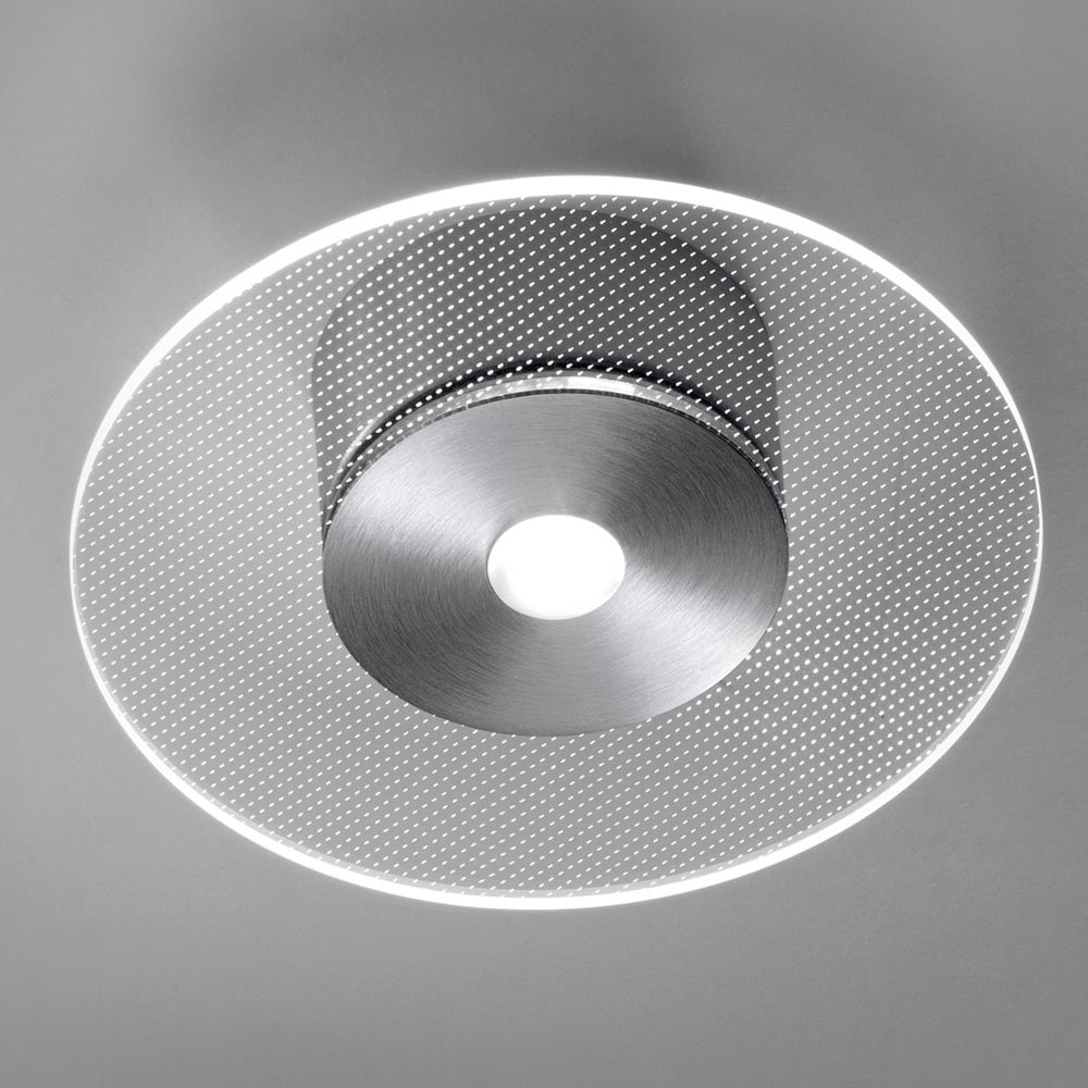 Lampă de tavan de interior realizată cu miez metalic și structură din plexiglas (PMMA) cu procesare micro-punct care permite o difuzie mai mare a luminii.