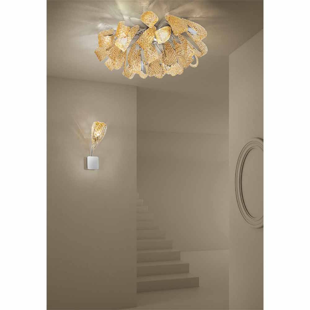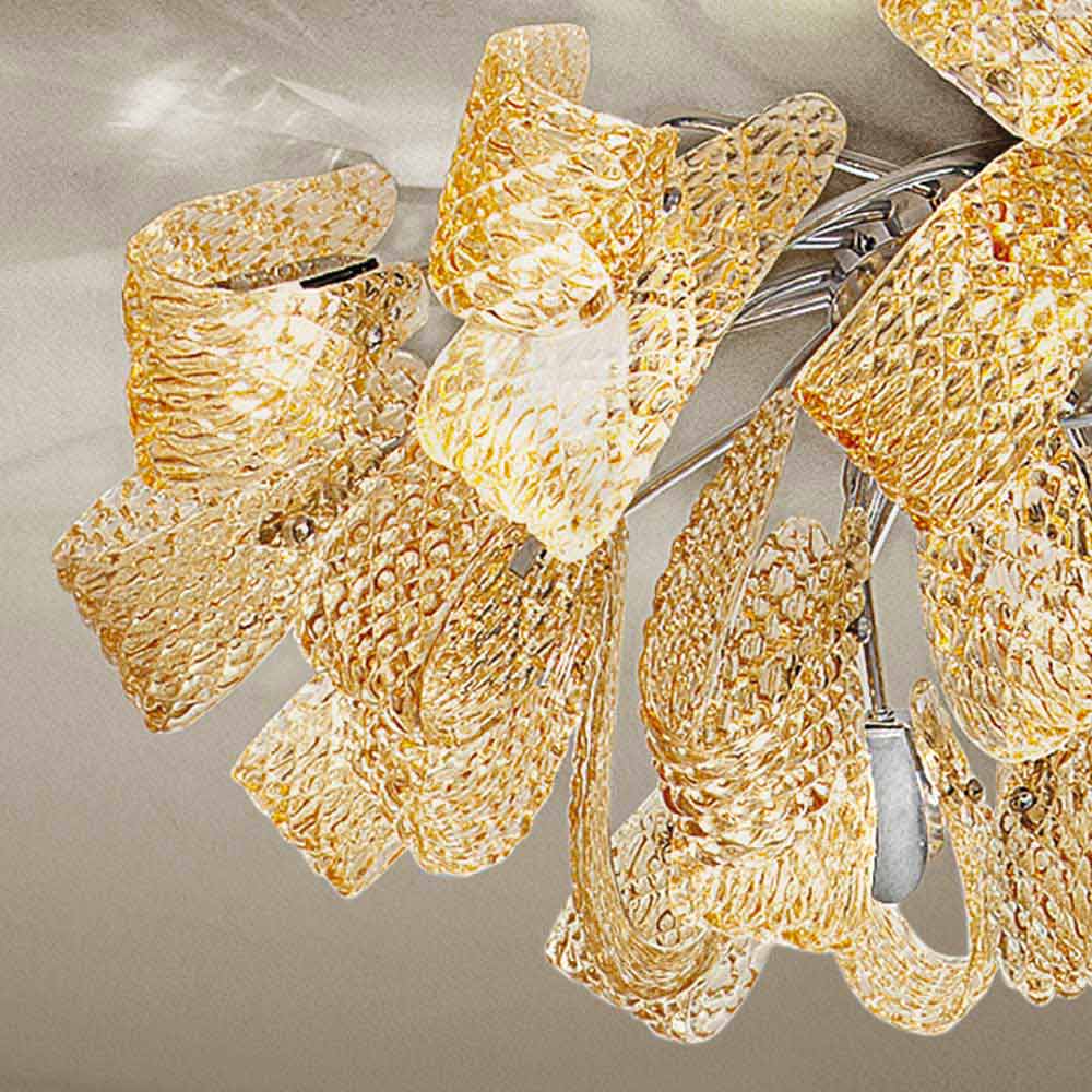 Lampă de tavan elegantă și maiestuoasă fabricată în Italia , realizată manual din sticlă venețiană finisată cu chihlimbar, cu detalii din metal cromat lustruit . O idee de iluminat compusă din panglici voluptoase și texturi neobișnuite care îi conferă originalitatea estetică și un sentiment de dinamism . Ceea ce este izbitor este textura geometrică care acoperă suprafața sticlei pe care se reflectă lumina în detaliile metalice pentru jocuri minunate de reflexii . Rezultatul este o minunată plafonă capabilă să se adapteze la orice mediu contemporan și să dea caracter spațiilor mai clasice, dovedindu-se deosebit de versatile.