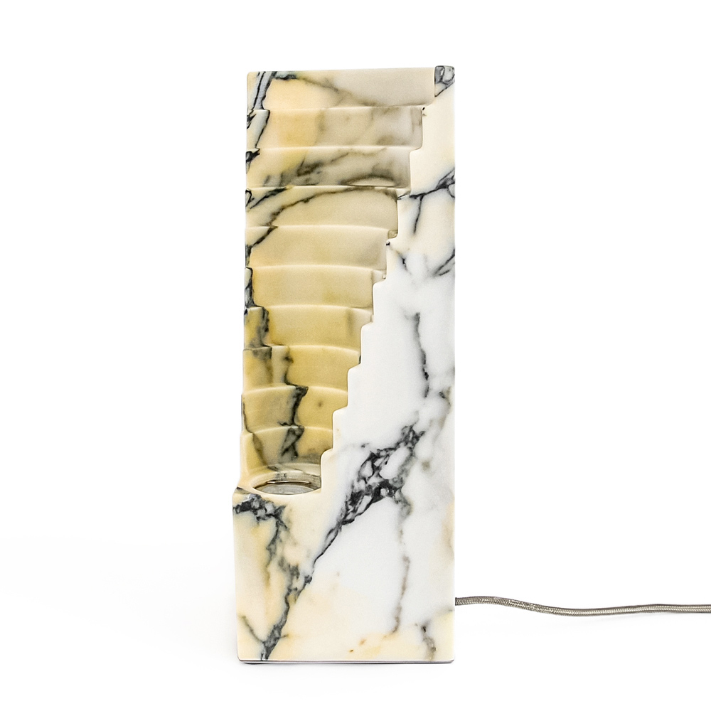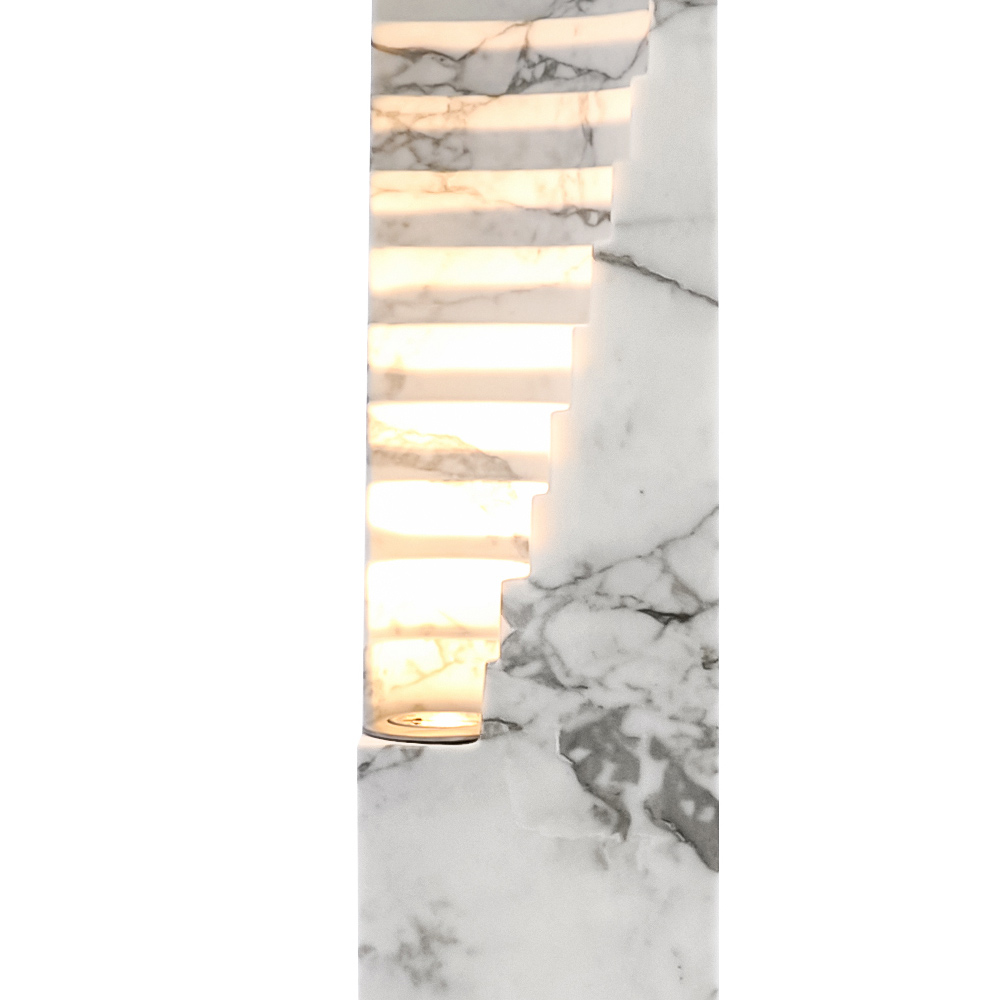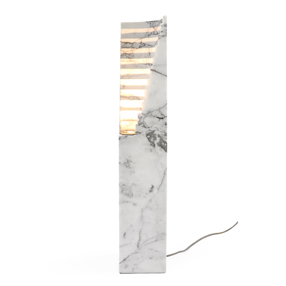 Lasa-te fermecat de aceasta lampa de marmura , o adevarata bijuterie a designului contemporan . Structura verticală, maiestuoasă și zveltă, este sculptată cu experiență pentru a lăsa lumina să filtreze prin liniile sale geometrice . Fiecare segment de marmură, cu venaturile sale unice, devine o pânză vie care captează și difuzează lumina într-un joc de clarobscur care îmbogățește orice mediu.