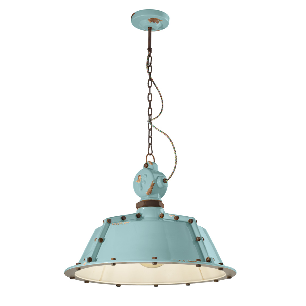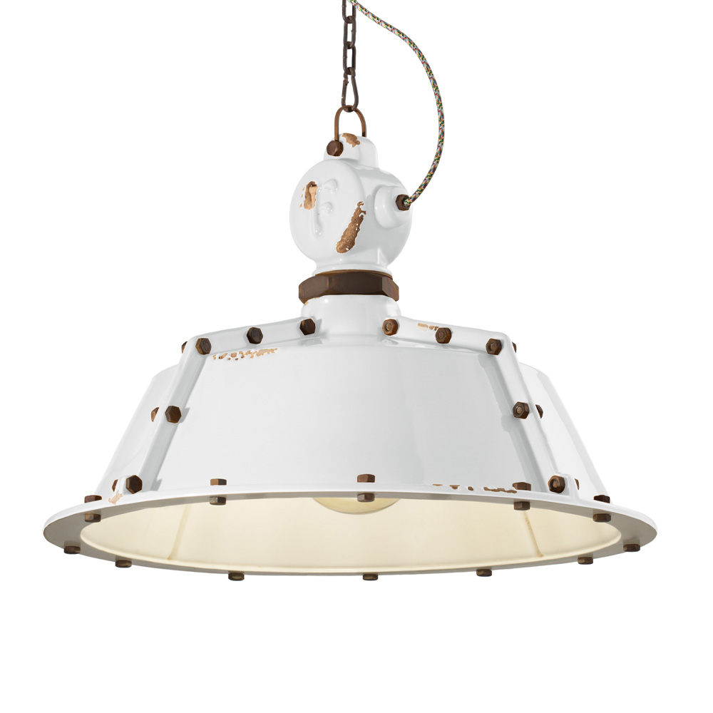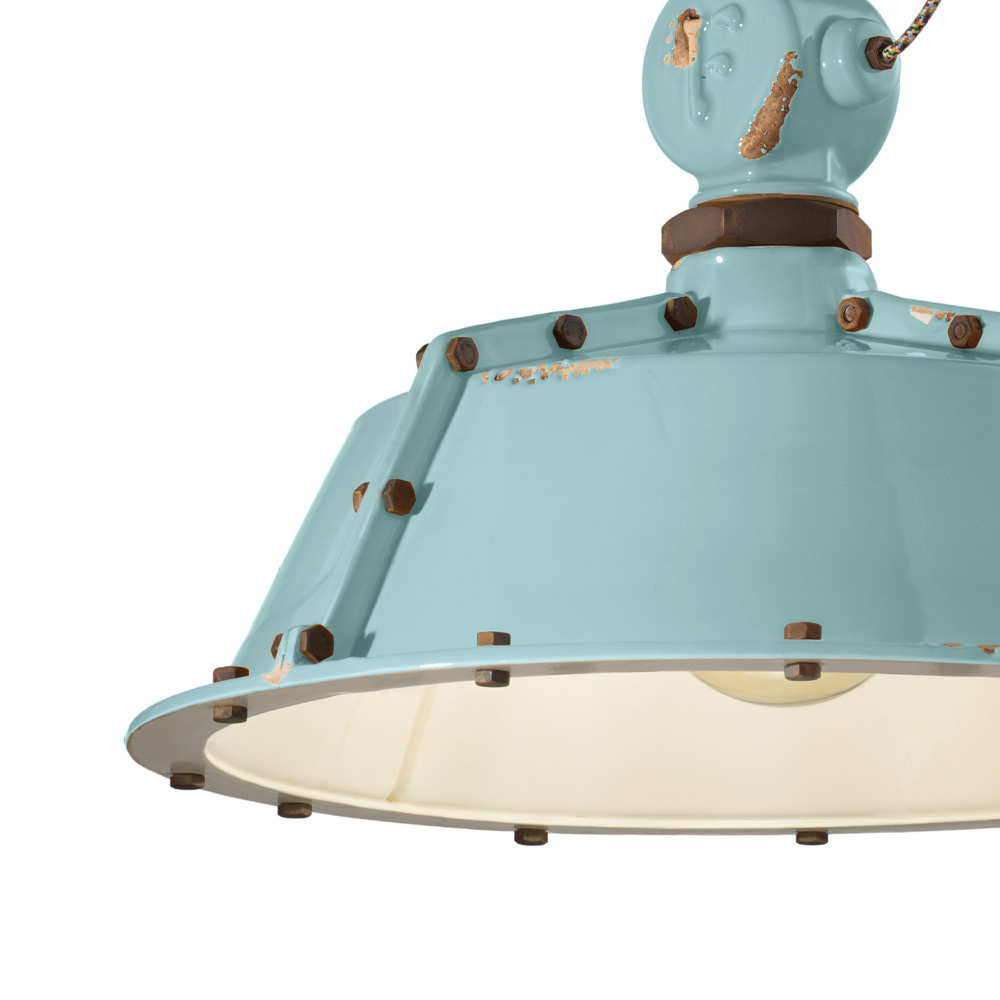 Lampă suspendată realizată manual din ceramică și fier, design industrial realizat în Italia de Ferroluce.