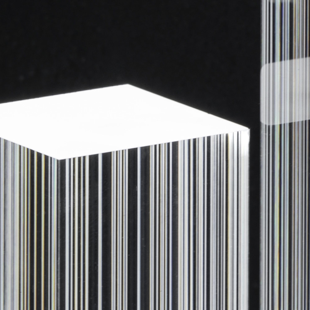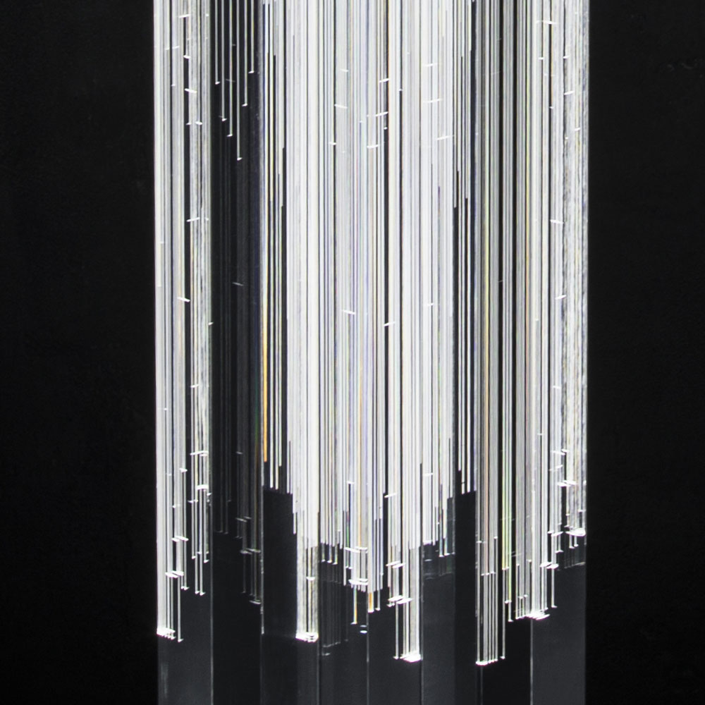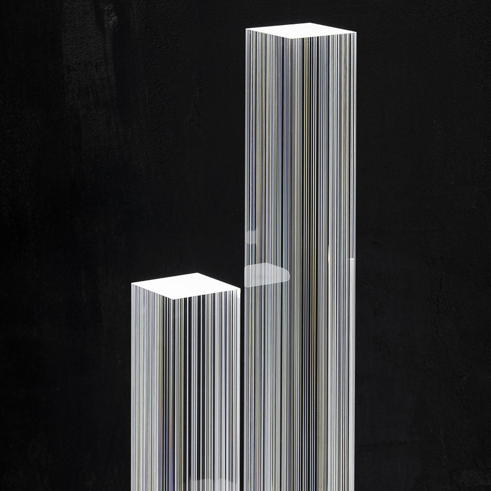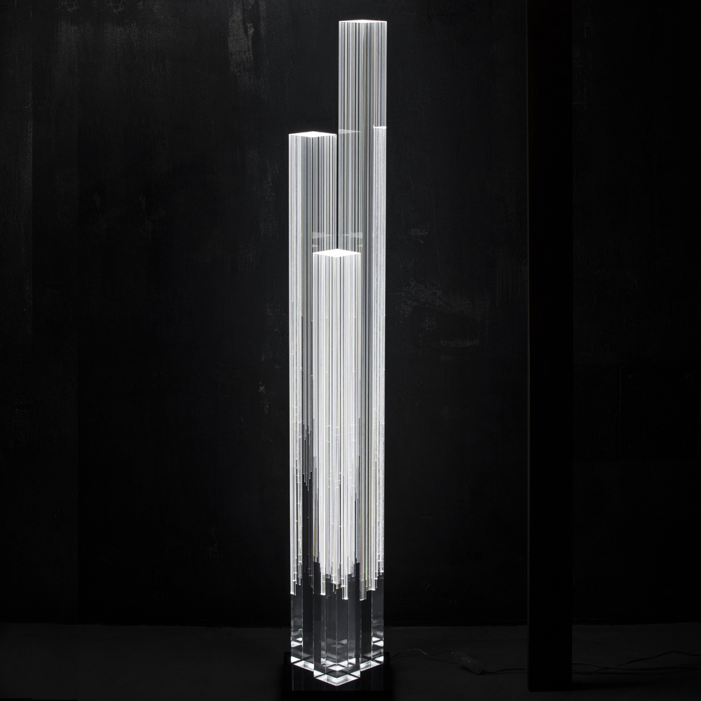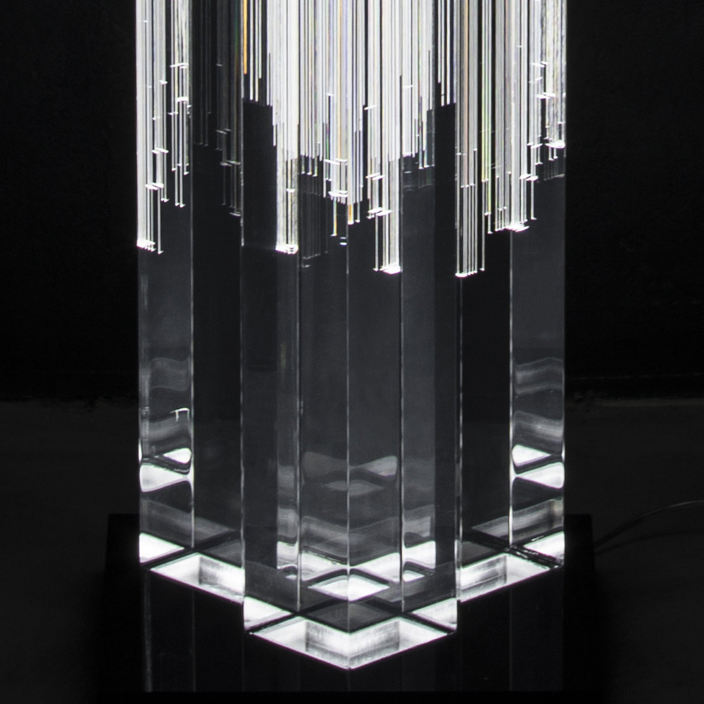 Această lampă de podea este compusă din blocuri unice de cristal acrilic tăiate și gravate cu tehnologie laser și o bază cu corpul de iluminat LED.
