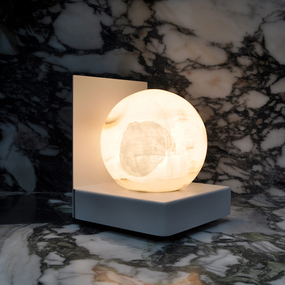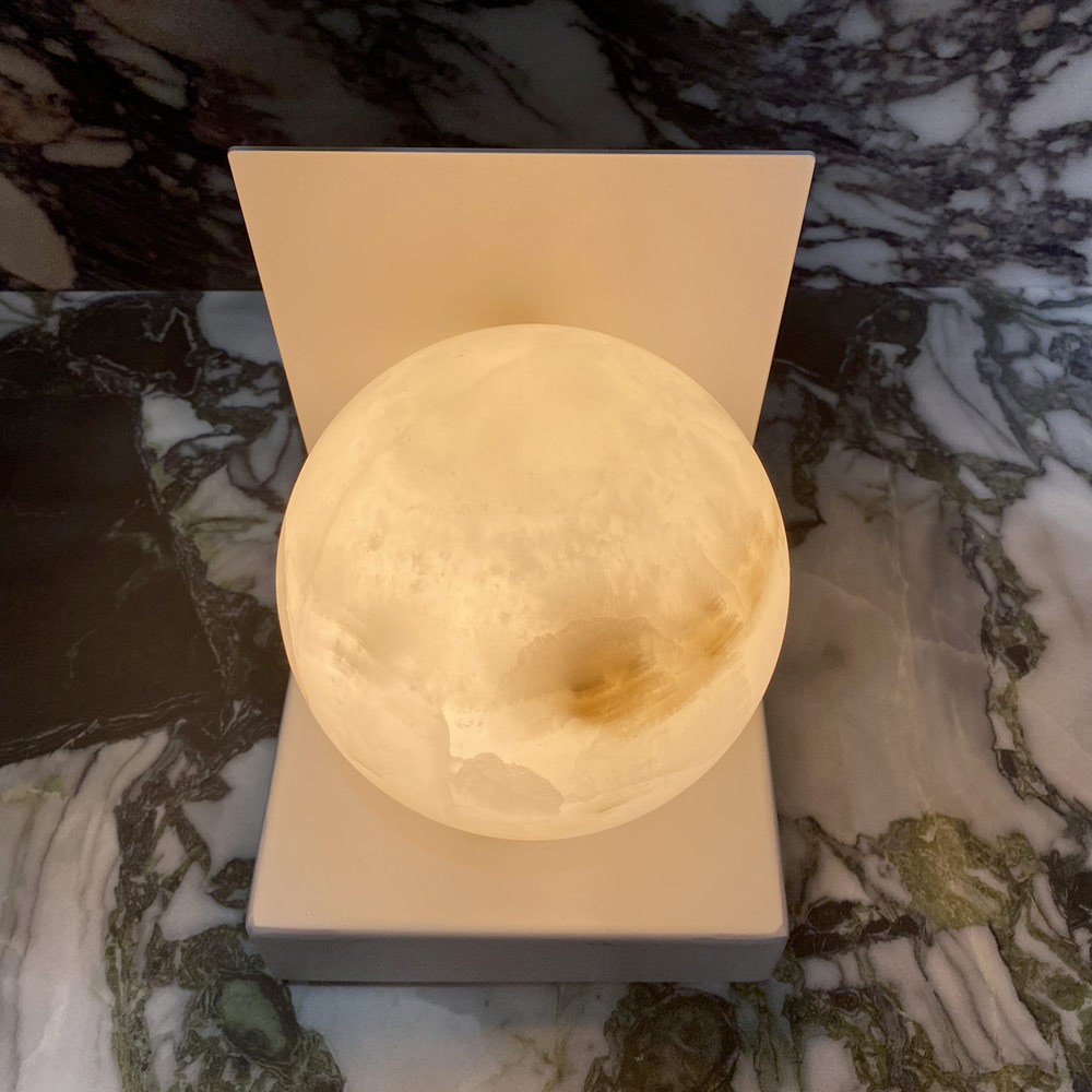 Baza solidă și elegantă contrastează frumos cu moliciunea sferei luminoase, creând o piesă de design modernă și atemporală . Fiecare lampă este unică, nu numai ca formă, ci și prin nuanțele și design-urile pe care natura le-a imprimat marmurei, făcând-o o sculptură luminoasă care încălzește mediul cu prezența sa.