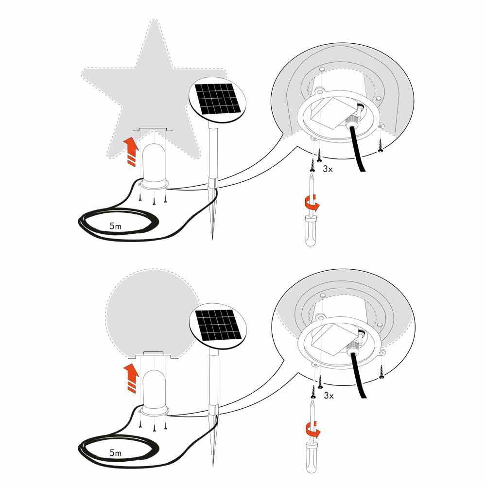 - accesoriu solar pentru exterior : include un sistem de iluminare LED monocromatic alb instalat permanent cu un modul solar extern cu baterie integrată (1800mA) care captează lumina soarelui în timpul zilei și apoi îl transformă în electricitate. Este necesară o cantitate suficientă și adecvată de iluminat solar pentru încărcarea corectă a lămpii, care se aprinde independent la amurg printr-un senzor de lumină. Acest sistem nu necesită prize electrice, protejând mediul înconjurător. Ideal pentru iluminarea cărărilor, balcoanelor și curților. Durata cu încărcare completă: aproximativ 6 ore. Consum de energie: 2 wați, temperatură: alb cald 3000K, cablu negru 5m.
